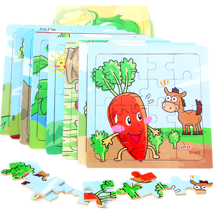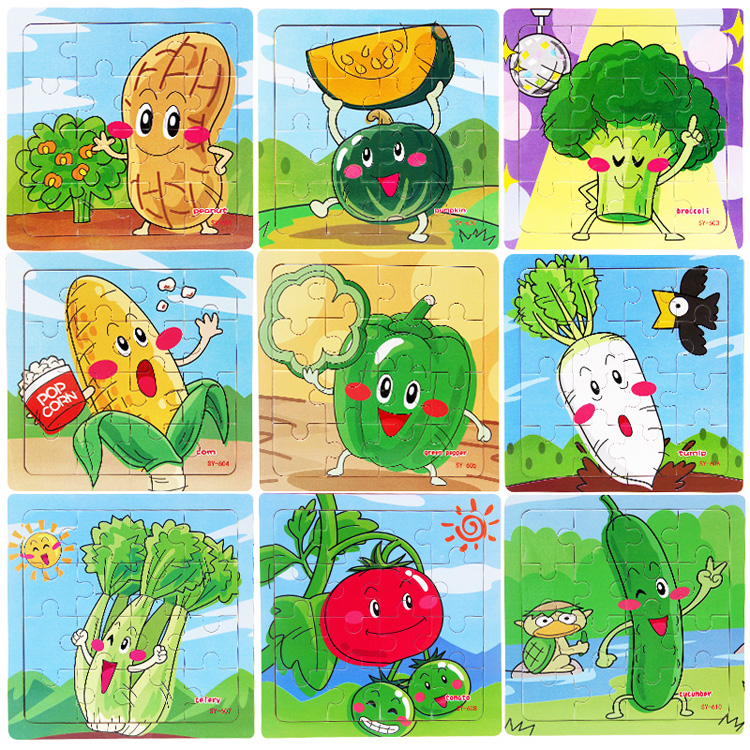 Пазлы с картинками различных фруктов и овощей. Пазл состоит из 16 одинакового размера деталей.