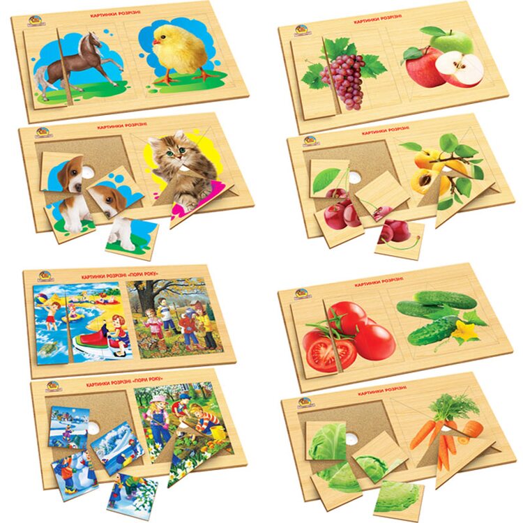 Сборка оригинальных и уникальных в своем роде пазлов картинок. На основании размещено 2 пазла по 4 детали с изображением различных животных, птиц. Казалось бы одинакового типа головоломки, но нет у пазлов по разному разрезаны детали, что усложняет задачу для малыша.
