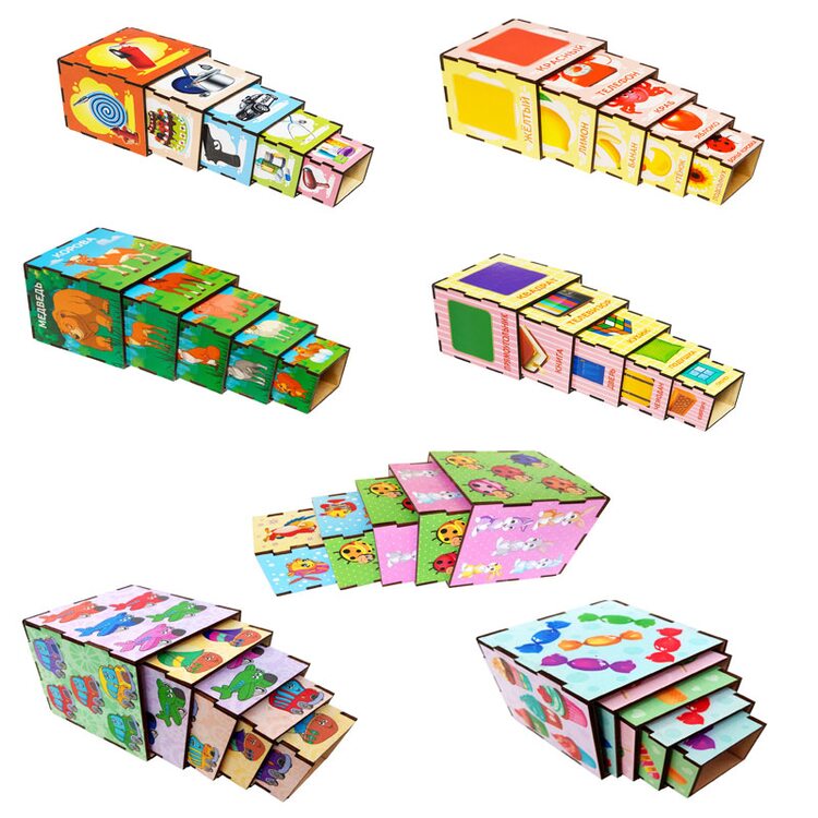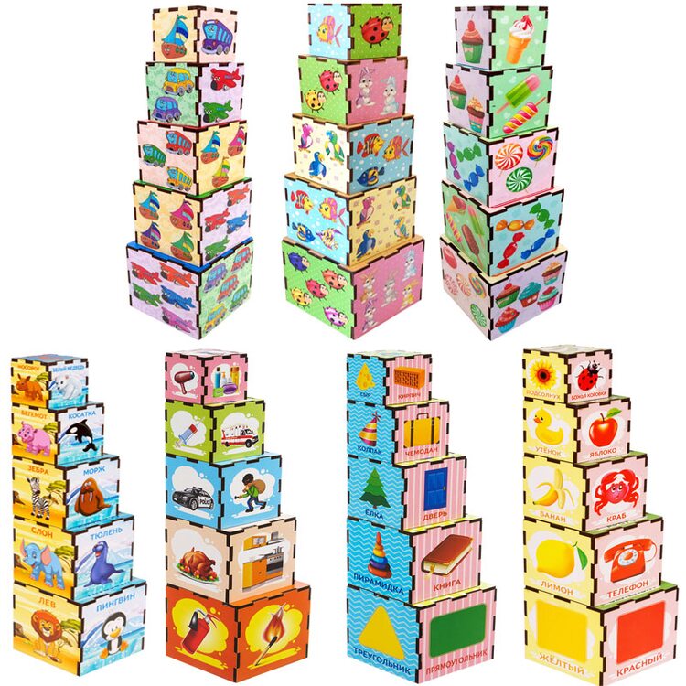 Серия развивающих деревянных пирамидок в виде 5-ти кубиков разного размера. На гранях кубиков нарисованы рисунки различных тематик: животные, птицы, насекомые, транспорт, профессии, сладости, цифры, цвета, фигуры (формы). Играя, малыш сможет выстроить большую башню из кубиков, познакомится с фигурами, научиться считать, проводить ассоциации.