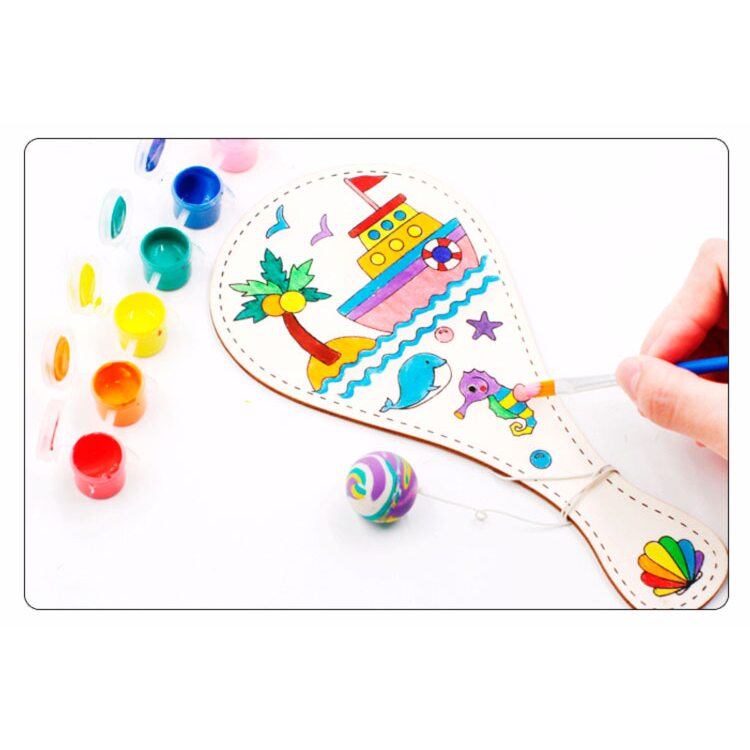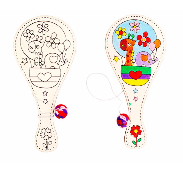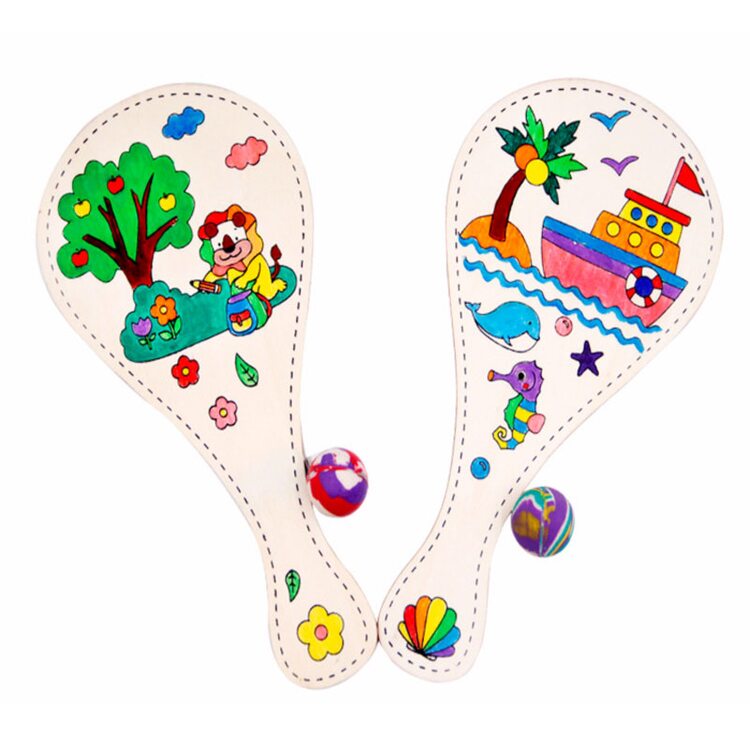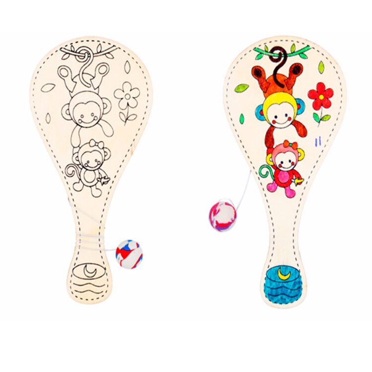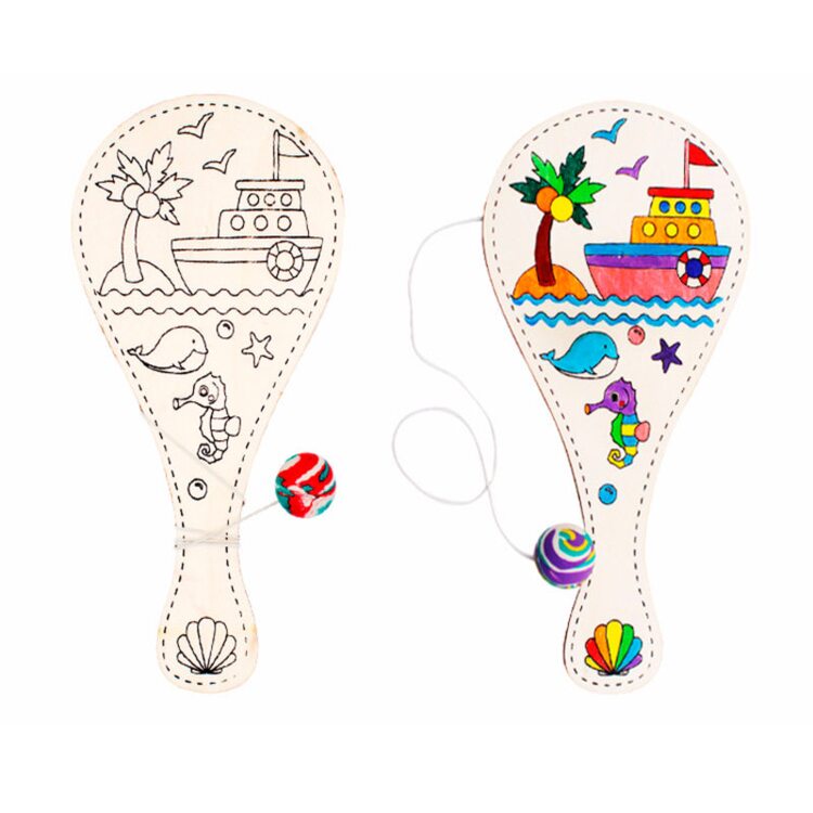 Деревянная игрушка выполнена в виде деревянной ракетки с узором, которую нужно разрисовать с помощью красок, карандашей или фломастеров. К ракетке привязан длинный шнурок на другом конце которого прикреплён небольшой шарик. Когда игрушку, зажатую в руке, резко отвести в сторону, шнурок, натягиваясь, тянет шарик за собой. Если правильно рассчитать силы и траекторию, шарик с лёгкостью попадает в по площади ракетки.