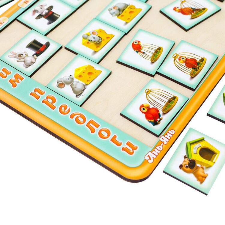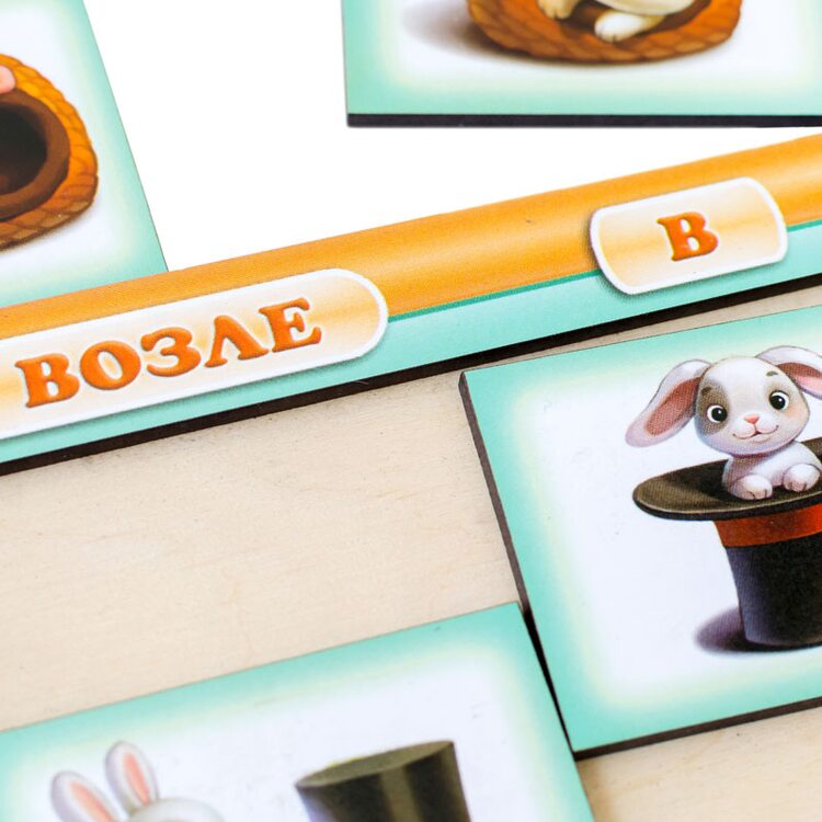 Игра представляет собой планшет-основание, на котором размещены 25 квадратных плашек с изображениями различных персонажей, которые визуально демонстрируют значение 5-ти предлогов: "в", "на", "возле", "за", "перед". Например: мышонок возле сыра, в сыре, на сыре, за сыром, перед сыром и т.д. Игра представлена на украинском и русском языках.