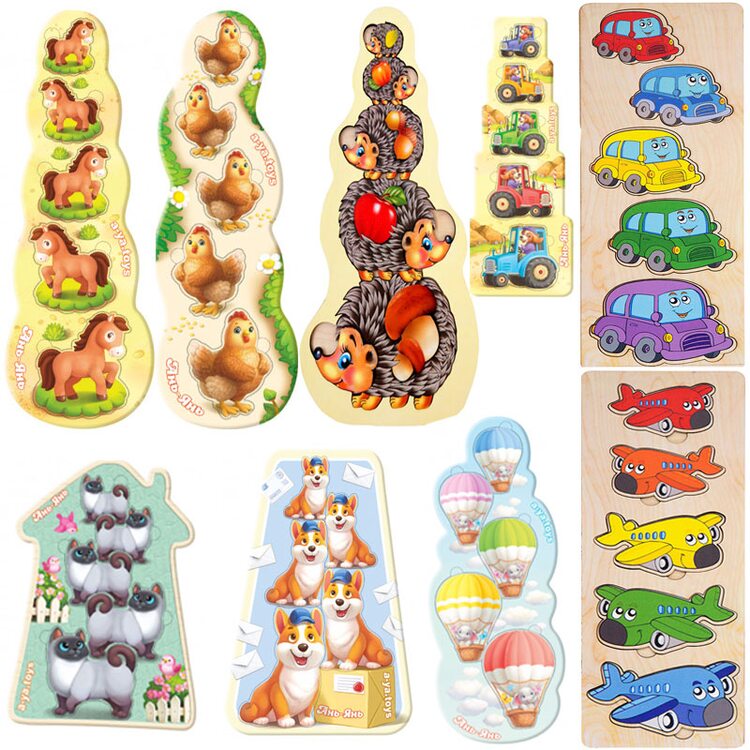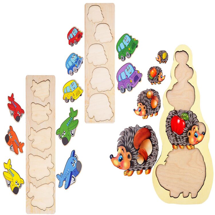 Разбираемся в размерах с помощью вкладышей различных тематик, где животные или транспорт представлен в разных размерах от меньшего к большему и наоборот. Играя, ребенок на практике сможет увидеть в чем разница между вкладышами, где лошадка большая, а где маленькая или средняя и т.д.