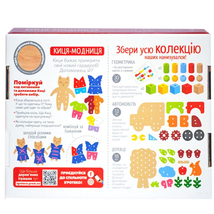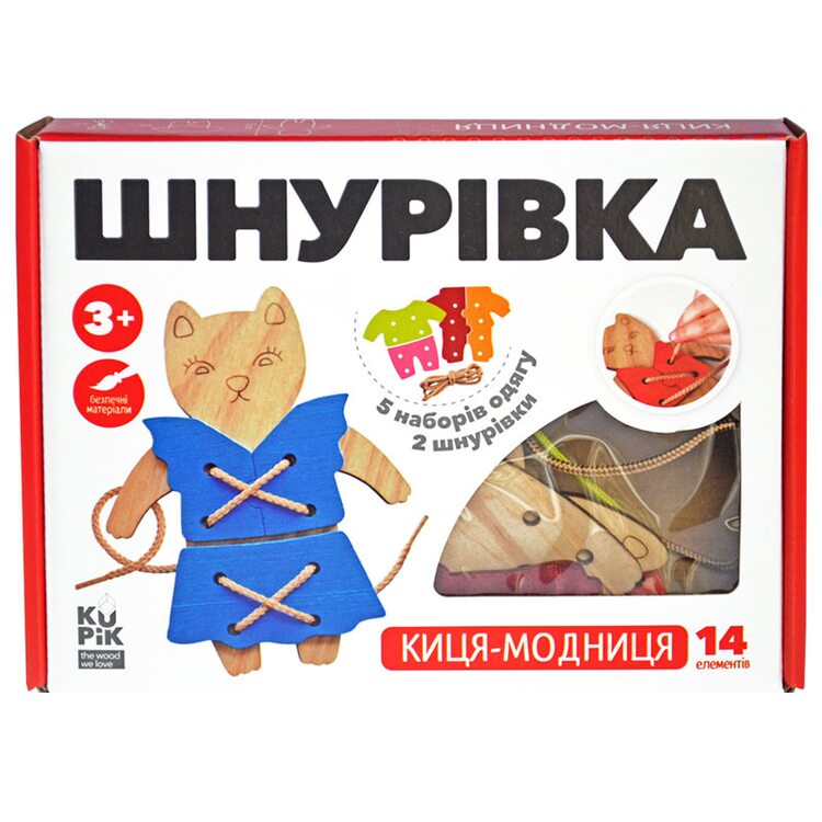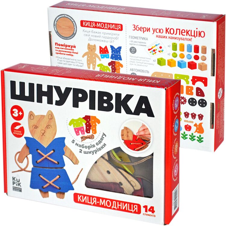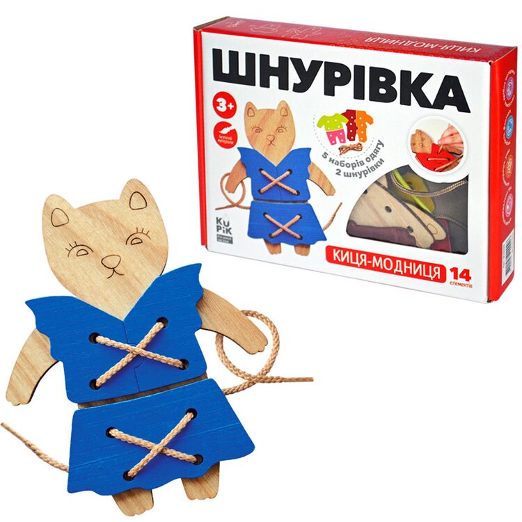 Помоги нашей кошечке подобрать правильный наряд. В набор входят 5 комплектов одежды для кошки, которые можно комбинировать и 2 шнурочка. Научись шнуровать разными способами. Примеры шнурование приведены на упаковке.