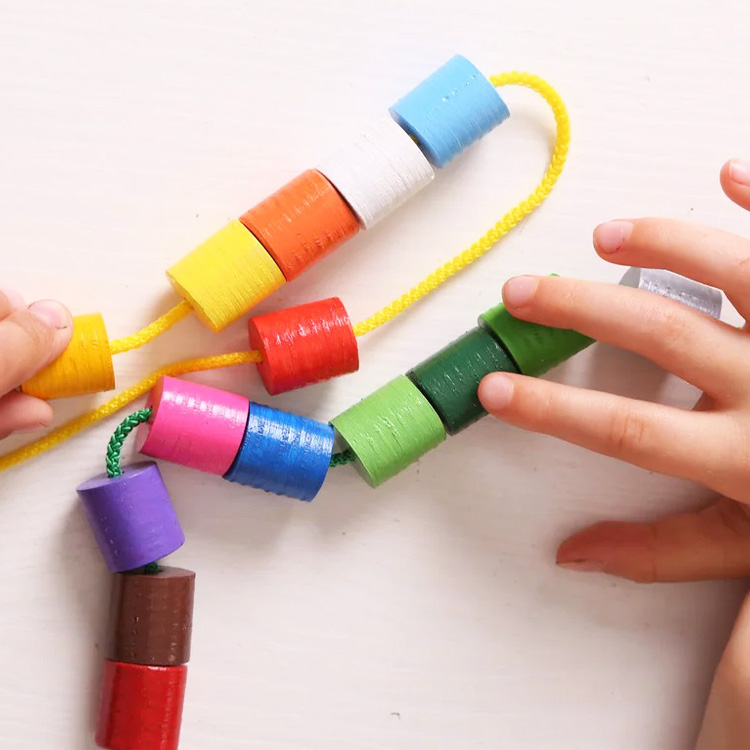Шнуровка с одинакового размера деталями в виде цилиндров. Детали представлены в различных цветах и их оттенках, всего 16 цветов. Играя, ребенок развивает моторику, знакомится с цветами и их оттенками. Учимся нанизывать детали на цветные шнурочки, сортируем, считаем их.