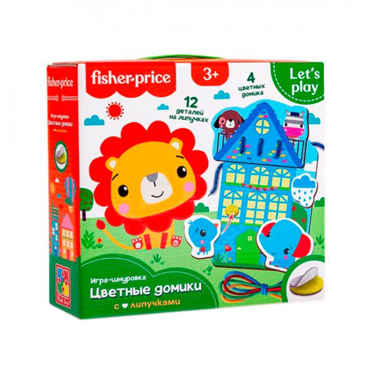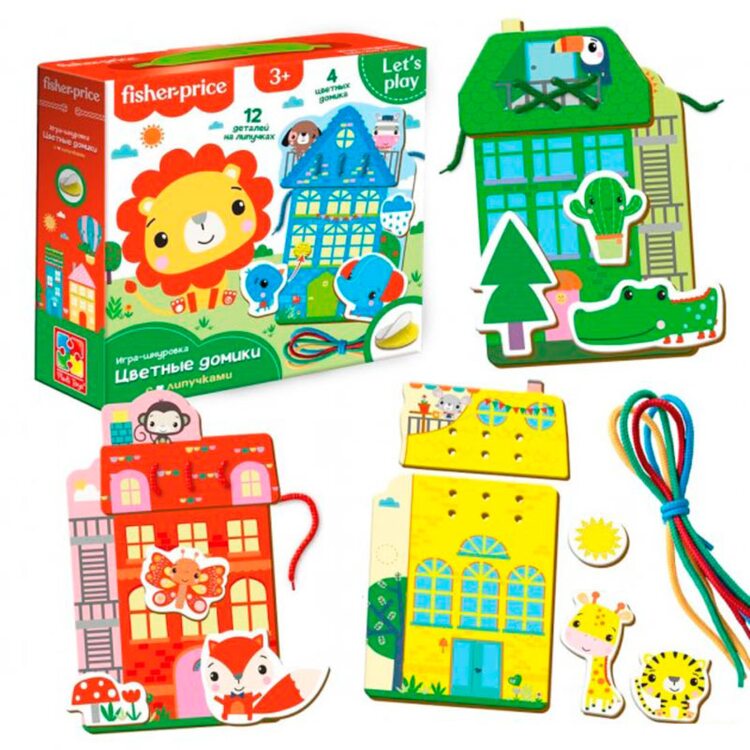 Шнуровка с цветными домиками и шнурочками. В наборе 4 домика и 4 шнурочка 4-х цветов: красный, жёлтый, голубой и зеленый. К домику нужно пришнуровать крыши такого же цвета, что и сам домик, а также прикрепить различные предметы с помощью липучек, цвет которых будет совпадать с цветом дома. Ребенок может пофантазировать и сделать домики разноцветными: к красному домику пришнуровать зеленую крышу и т.д.