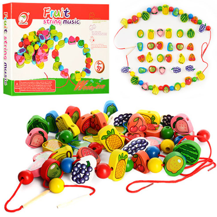 Чудова гра! Дитина любить спостерігати за нанизуванням деталей на нитку. У нашому наборі було дві ниточки з голочками, фрукти теж дублювалися. Мінус один - круглі деталі, де немає малюнків, занадто маленькі. |
