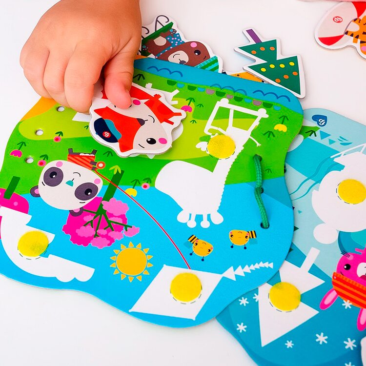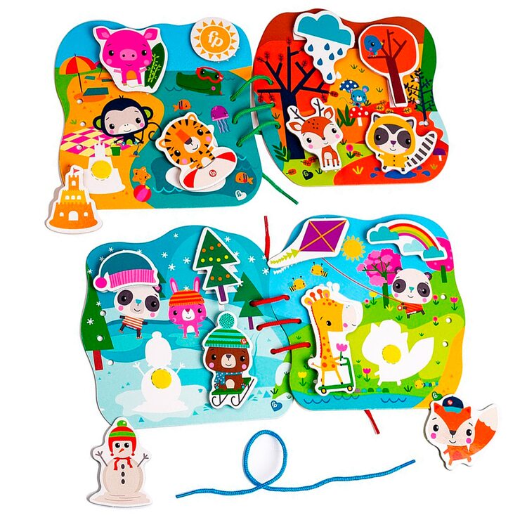 Шнуровка «Времена года» может предложить вашему малышу сразу несколько игр. Сначала можно попросить ребёнка найти определенное животное, затем разместить их (прикрепить к липучке) согласно сезонных занятий: летние, осенние, зимние и весенние. Ну и, конечно, попробовать продеть шнурок в как можно большее количество дырочек. И поверьте, малыш будет это делать всё лучше и лучше, проявляя своё усердие.
