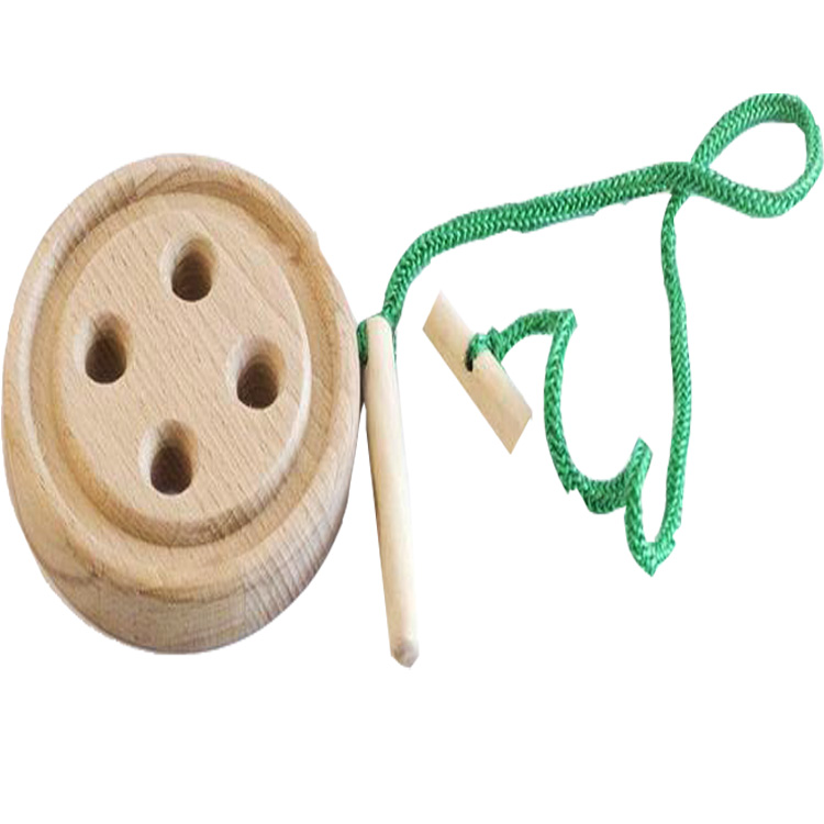 Деревянная шнуровка в виде пуговицы со шнурок с иглой и наконечником. Прошнуровывая каждую дырочку на пуговке, малыш развивает мелкую моторику, тренирует усидчивость.