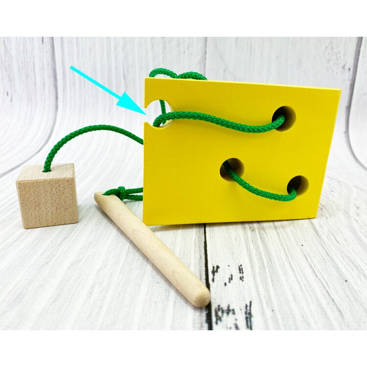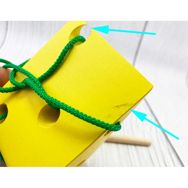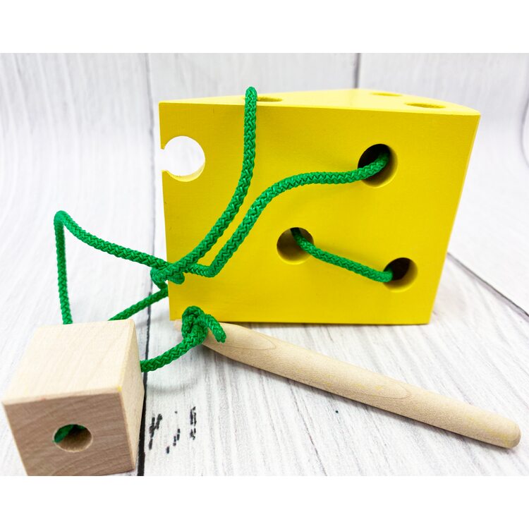 В комплект кроме сыра, сделанного из дерева, входит шнурок с держателем на конце.Ярко-желтый кусочек, как и подобает хорошему сыру, весь в дырочках, их девять. Отверстия достаточно больших размеров, поэтому через них удобно протягивать шнурок с помощью держателя в виде палочки-иглы.
