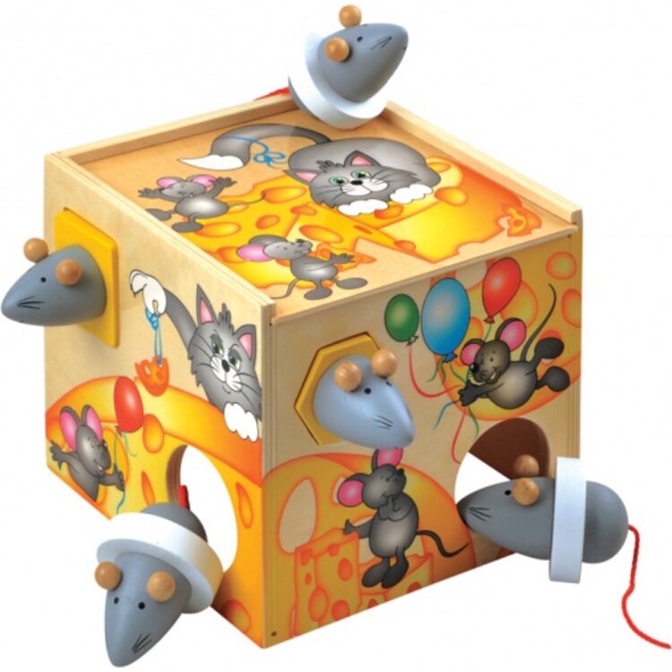 Красочная деревянная развивающая игрушка, представляющая из себя куб с прорезями различной формы и размера: круг, квадрат, шестиугольник. В эти прорези можно вставлять деревянных мышат серого цвета. Грани куба украшены яркими рисунками, на которых изображены коты и мышата, воздушные шары и куски сыра.