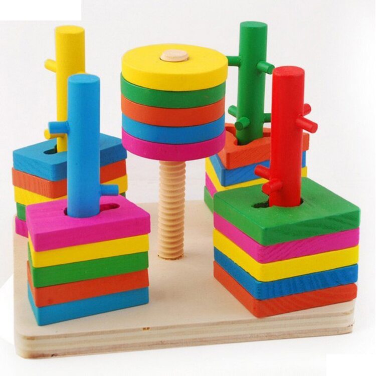 Деревянный сортер, который состоит из 5 различных штырьков, на четырех из них есть разное количество выступов, а на пятом - резьба для навинчивания круга.