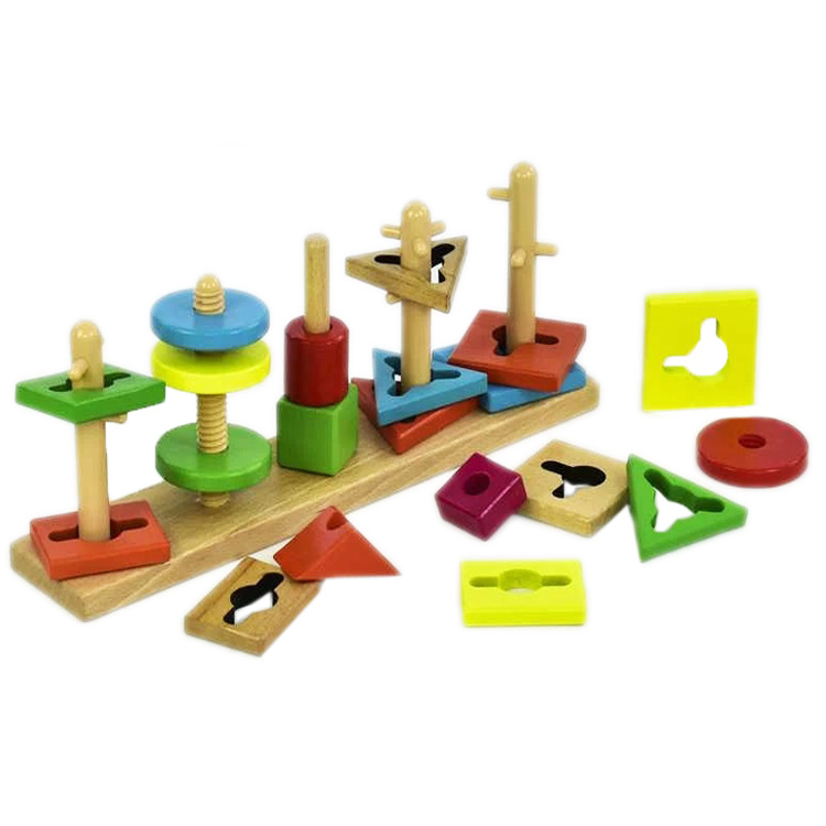 Яркая игрушка имеет деревянное основание, на котором прочно закреплены четыре стержня с различным количеством выступов, а один – с резьбой. На каждый стержень можно надеть только определенные геометрические фигуры: круг, треугольник, прямоугольник или квадрат. Причем при нанизывании необходимо учесть не только форму фигуры, но и внутренние выемки, которые необходимо сориентировать относительно штырьков.