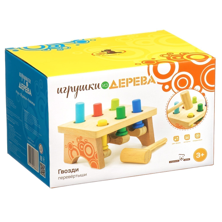 Сама игрушка выполнена из натурального дерева и является экологически чистой и безопасной, не способной причинить вреда здоровью ребенка или вызвать аллергическую реакцию. В дощечке имеется шесть отверстий, в которые вставлены так называемые гвоздики. Каждый гвоздик имеет свой цвет, что позволяет ребенку изучать цвета, считать, развивать мышление и логику.