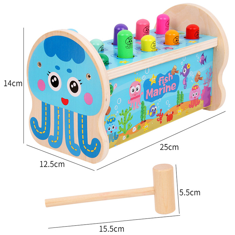 Стучалка для самых маленьких. Все детали надежно прикреплены, нет ни мелких, ни съемных деталей. Забивая одного осьминожка с другого отверстия выскакивает другой. Развиваем координацию движений. В набор входят 2 молоточка.