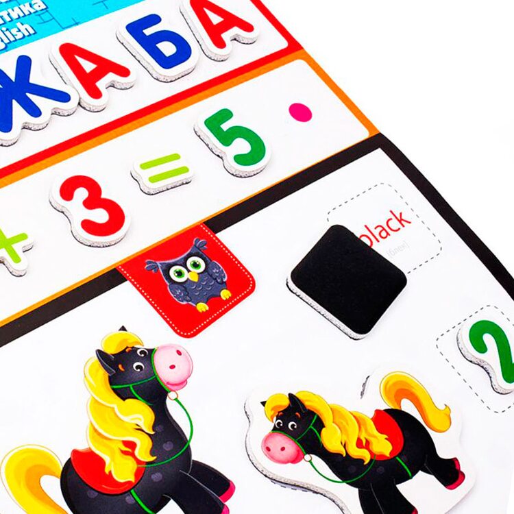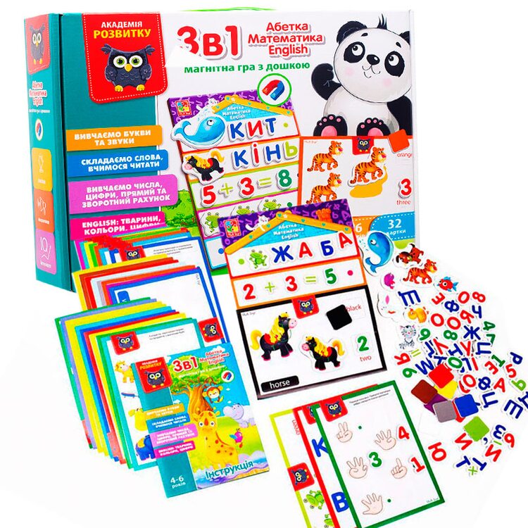 У наборі 32 картки з цікавими завданнями, 106 м'яких магнітів та магнітна дошка.