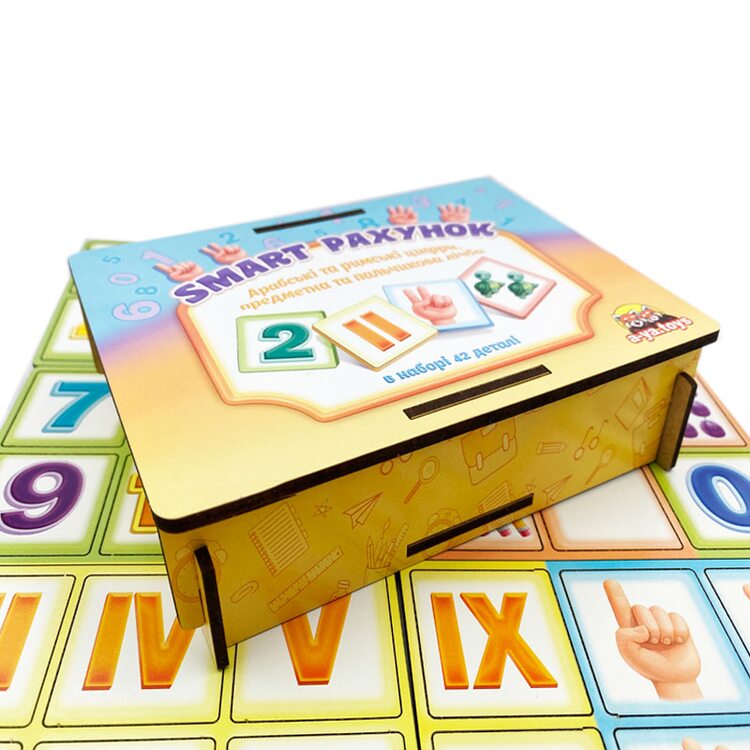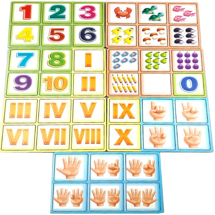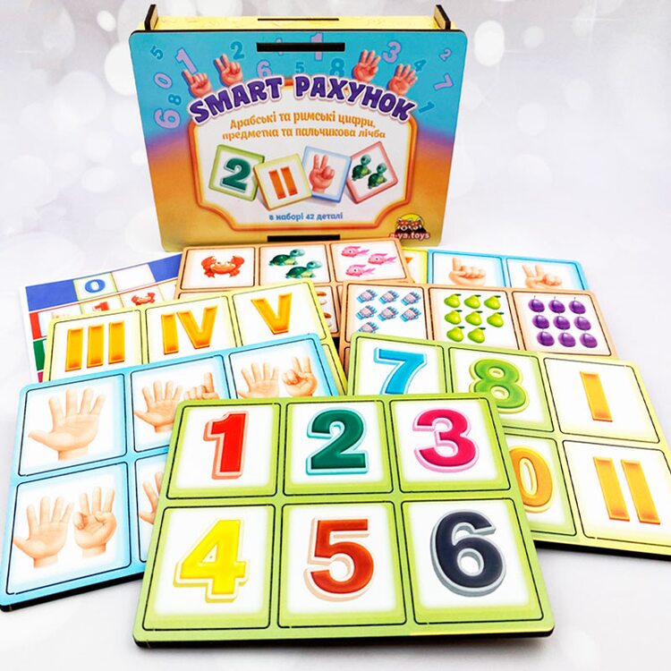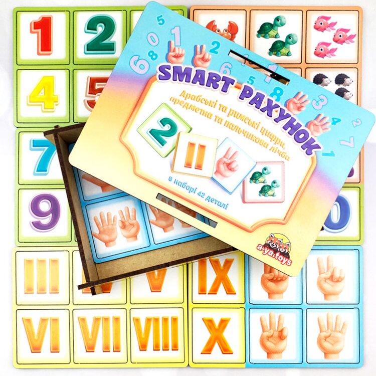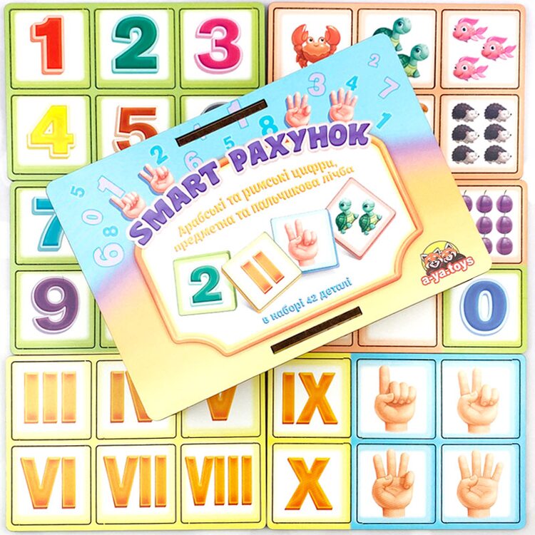 Набір для легкого вивчення арабських та римських цифр від 1 до 10, рахунку – пальчикового та предметного, арифметичних дій. До набору входять 42 плашки з цифрами, з тваринами або предметами, які намальовані у певній кількості, що відповідає певній цифрі, а також долоня людини для пальчикового рахунку.