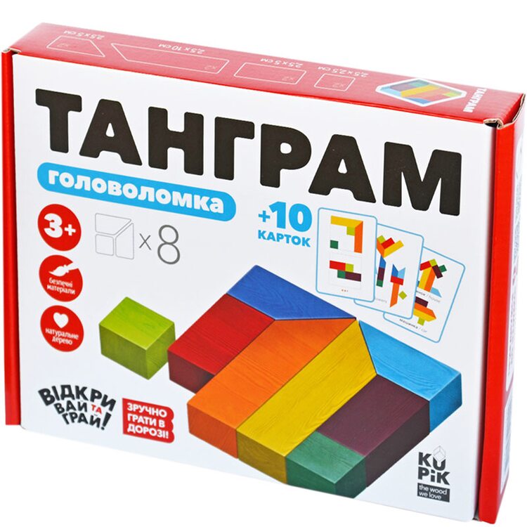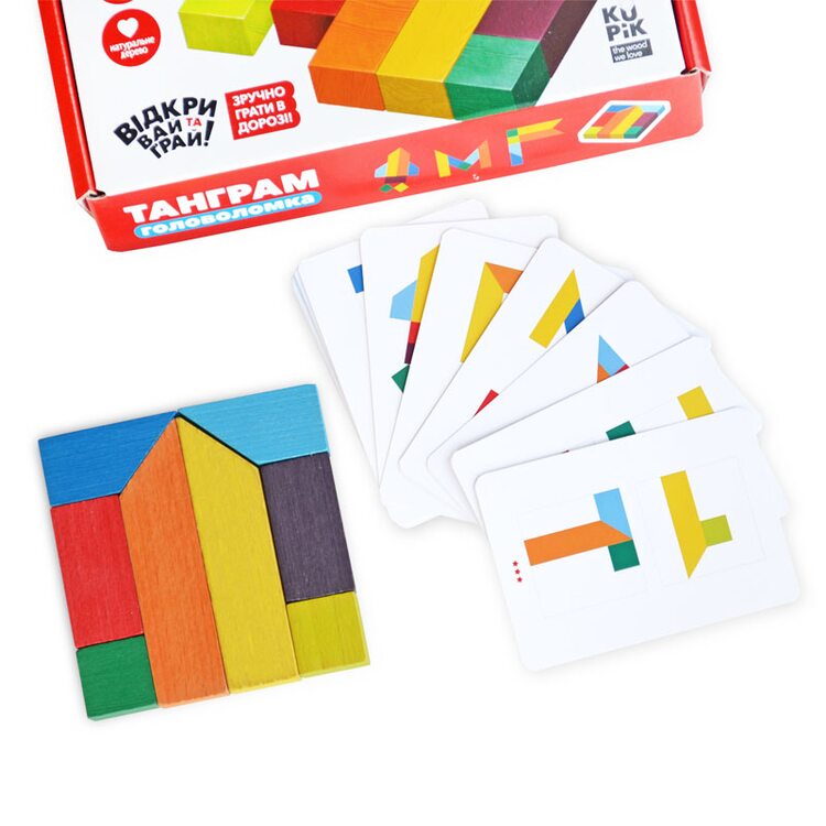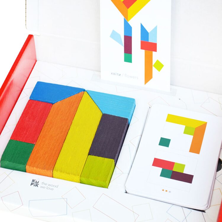 Головоломка "Квадрат" складається з 8 геометричних фігур - по 2 однакових фігури різних кольорів. З деталей головоломки можна викласти багато цікавих мозаїк: тварини, предмети, рослини, літери. У комплект входять 6 двосторонніх карток із завданнями різного рівня складності, а також 4 картки з мозаїками (18 мозаїк).
