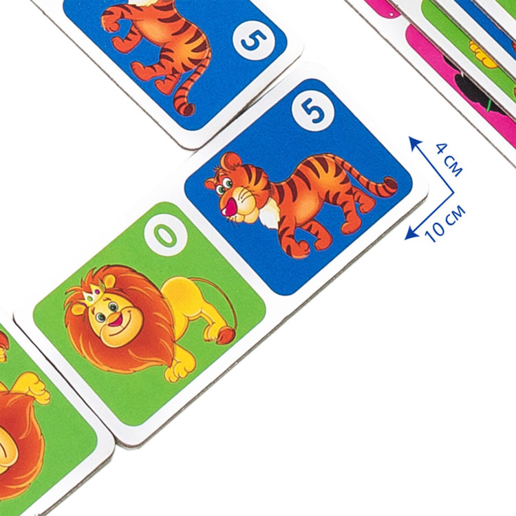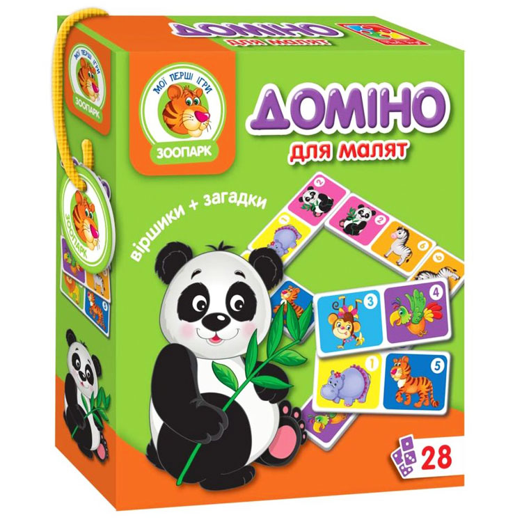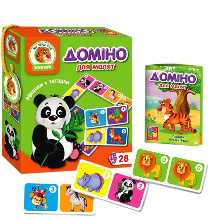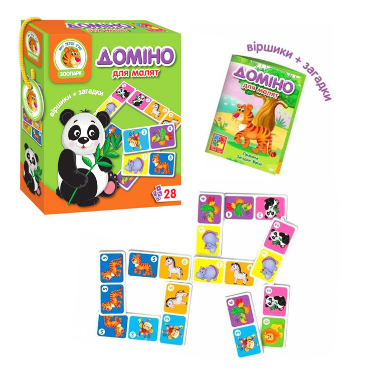 Класична гра доміно, але замість звичних точок на плашках зображені різні тварини. Адже з такими доміношками грати набагато веселіше. Набір складається з 28 картонних доміношек, а також листа-вкладиша з правилами гри, цікавими загадками для дитини і віршами про тварин на українській мові.