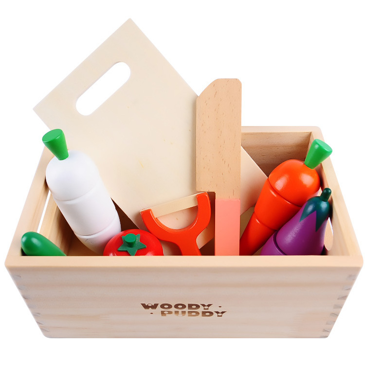 Естетичний компактний набір в дерев'яному ящику стане незамінним для маленького помічника на кухні. Всі фігурки овочевої нарізки виготовлені з дерева, вони приємні на дотик і безпечні. Баклажан, огірок, лимон і морквина складаються з декількох частин, їх можна розрізати за допомогою спеціального ножа. А кришку ящика зручно використовувати в якості обробної дошки.
