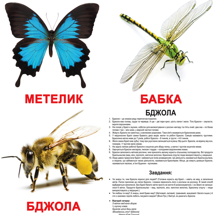 Комахи на картинках виглядають живими - вони обов'язково привернуть увагу допитливого малюка. Розглядаючи картки, дитина не тільки запам'ятає, як виглядає бджола, комар, гусениця, але і познайомиться з їх назвами українською мовою. Всього в наборі 20 великих карток з корисною інформацією для батьків на зворотному боці.