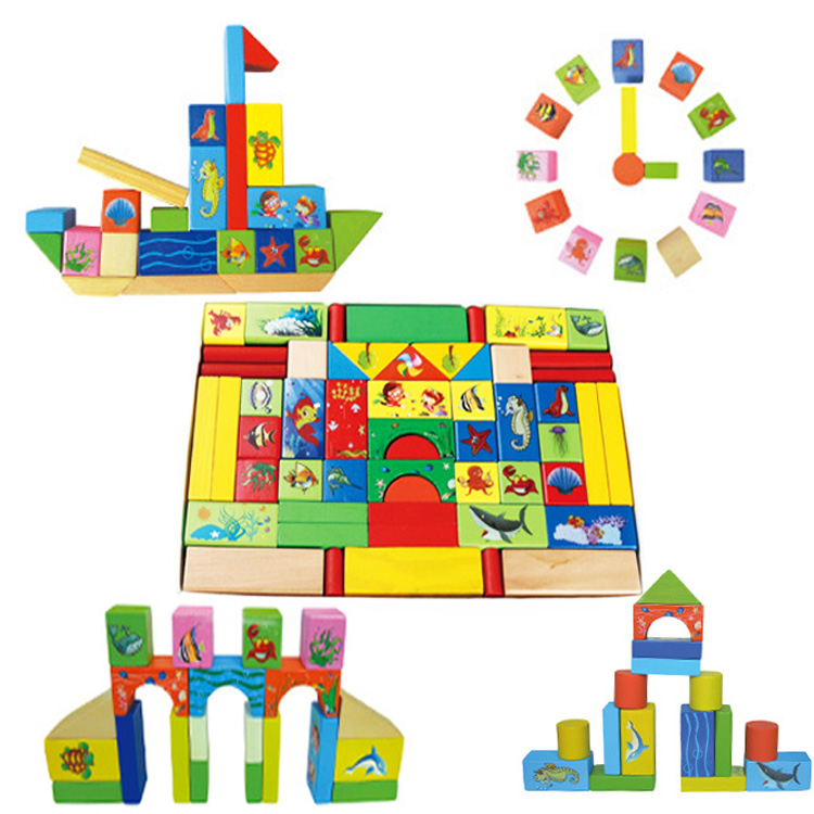 Дерев'яний конструктор із зображенням мешканців морів і океанів. Яскраві картинки тварин, насиченість кольорів, різноманітність геометричних фігур обов'язково зацікавлять маленького будівельника.