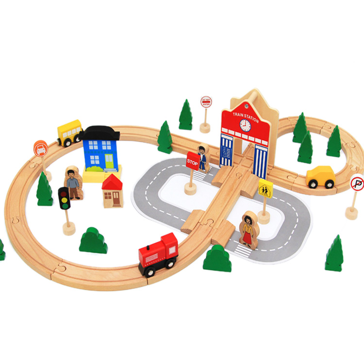 Споруда рейкової дороги супроводжується зведенням необхідної інфраструктури. Адже в наборі ТМ Dabitoy з 50 деталей є все, що потрібно для створення повноцінного функціоналу пасажирської станції: дорожня розмітка, знаки, іграшкові будиночки, вежа з годинником. Перевагою даного типу рейок є їх пристосованість для іграшкових поїздів і автомобілів. Рухливі фігурки на колесах - входять в комплект.