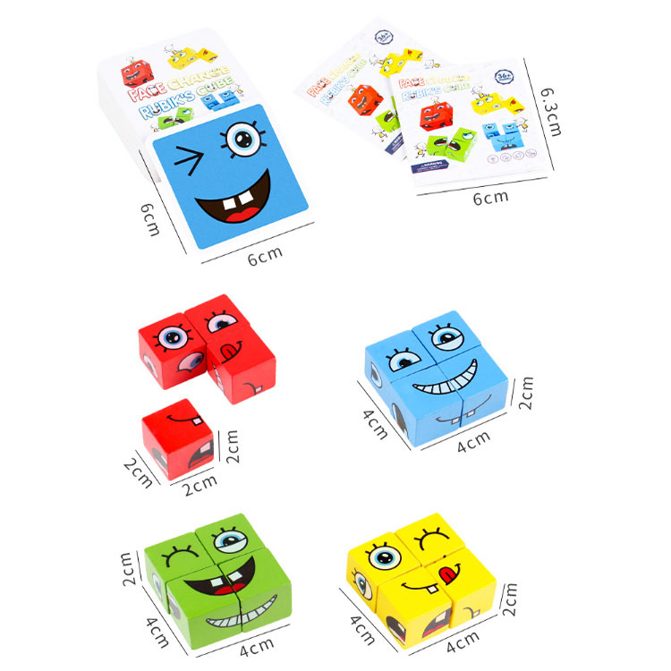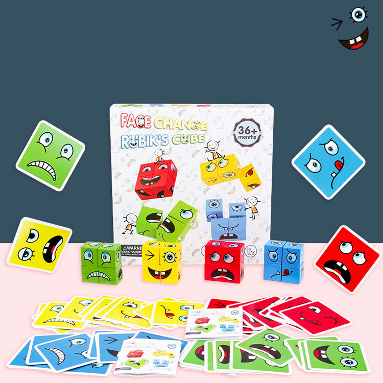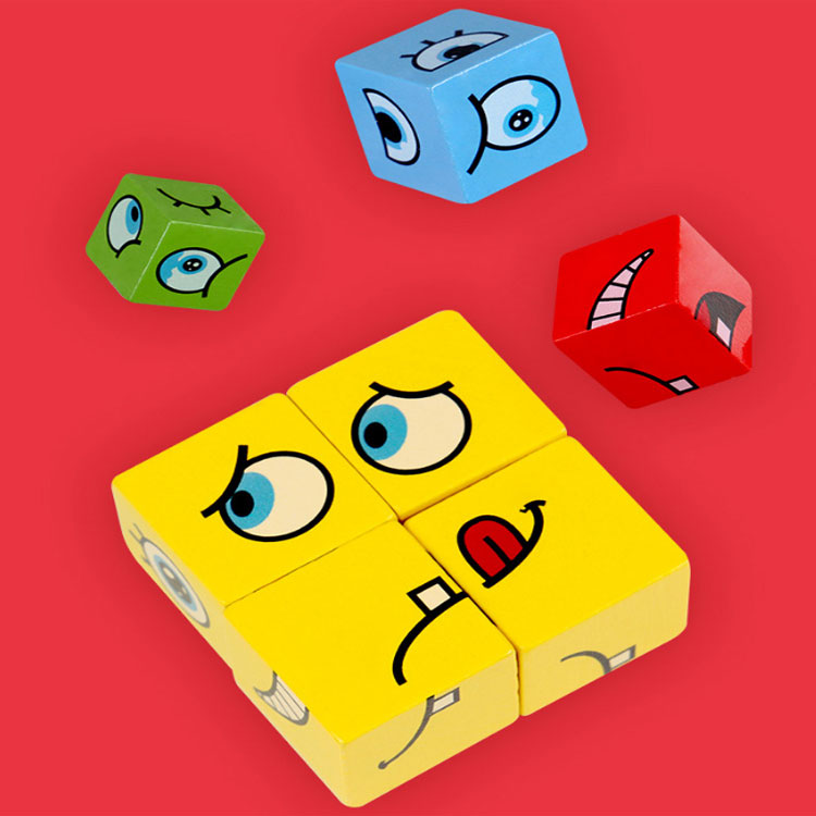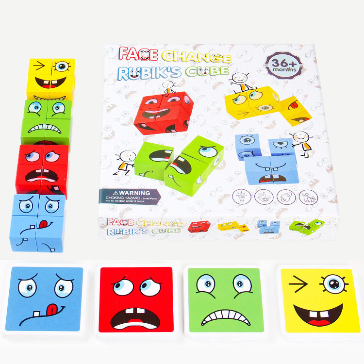 4 набори кубиків по 4 шт. червоного, блакитного, зеленого і жовтого кольорів. З кубиків потрібно зібрати обличчя з різними емоціями: сміх, радість, здивування, злість і т.д. Комплектація набору дозволяє грати одночасно 4-м гравцям. Також в набір входять картки з емоціями. Для кожного кольору кубиків такий же колір карток (по 16 карток). Збери мордашку і назви емоцію, яку вона показує.
