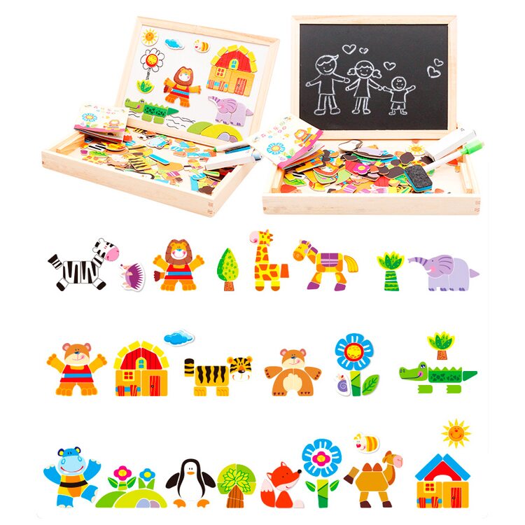 Захоплююча пригода в світ тварин разом з настільною грою і магнітиками. Набір включає все необхідне для творчого розвитку Вашого малюка: магнітні деталі із зображенням тварин, будівель, дерев, маркер, крейду, інструкцію з прикладами картинок, двосторонню дощечку.
