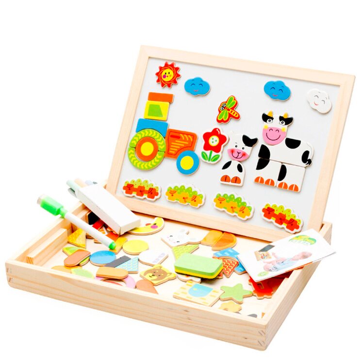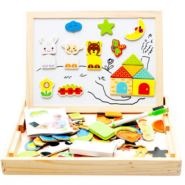 Валіза з фігурками і 2-х сторонньою магнітною дощечкою для малювання крейдою і маркерами на водній основі. З представлених в наборі фігурок можна складати забавні картинки. Захоплююче заняття як для малюка так і для його батьків.