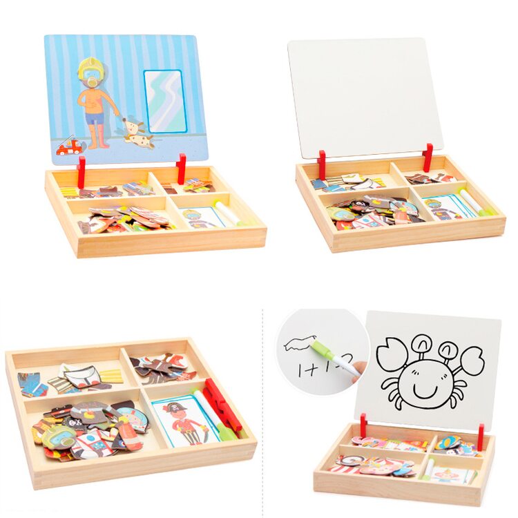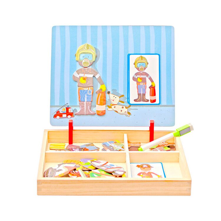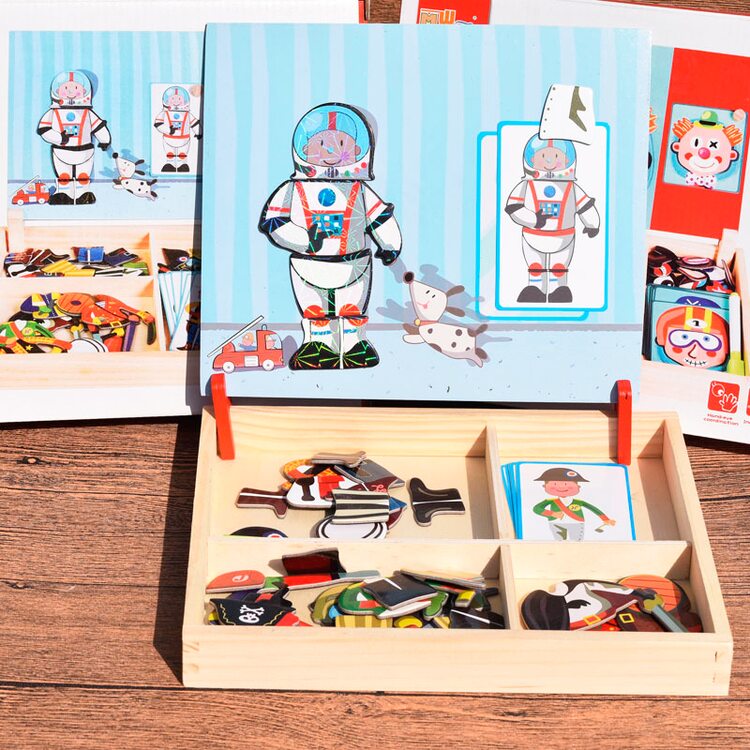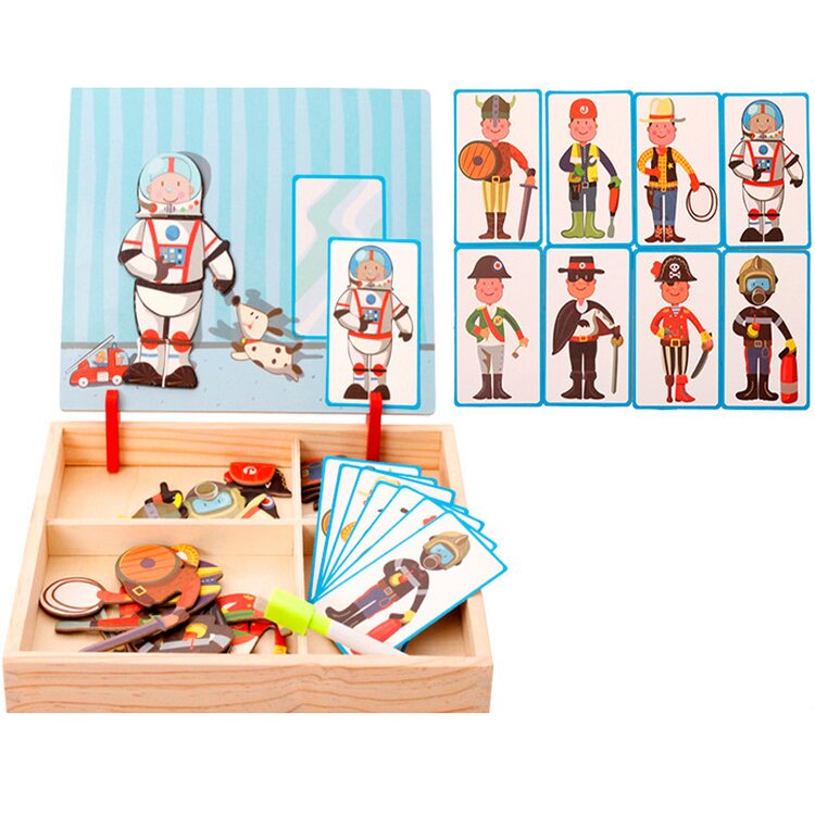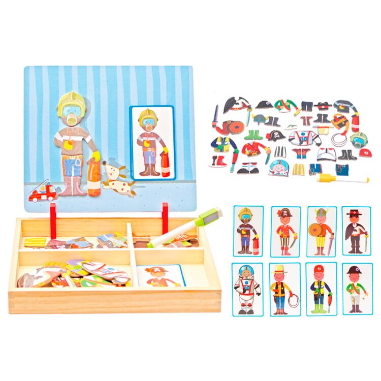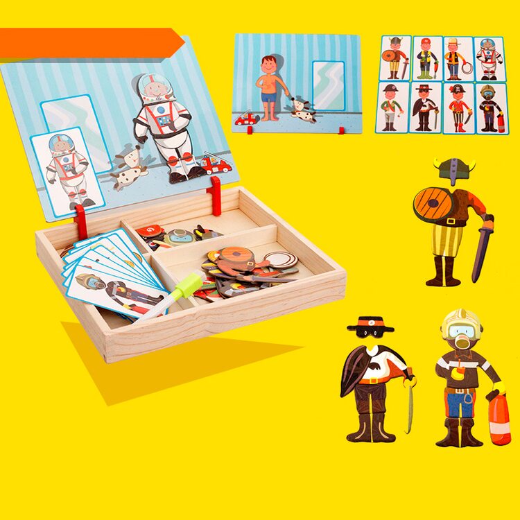 Основи логіки, аналізу та образного мислення закладе в дитині магнітна гра "Герої". У компактній коробці - набір деталей одягу для космонавта, пожежника, лицаря. З'єднати разом розрізнені частини і отримати цілісну картинку, а також підібрати герою правильні аксесуари - ось завдання юного модельєра. У дерев'яній коробці малюк знайде картки із зразками і маркер, яким можна малювати на зворотному боці дошки. Простота і доступність магнітної гри "Герої" зробили її надзвичайно популярним товаром у батьків.