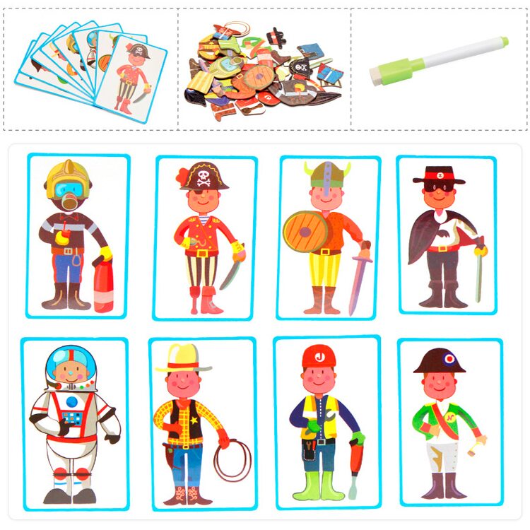 Набори одягу відомих героїв або тих, ким Ваші діти хочуть бути після чергового переглянутого мультфільму або кінофільму: космонавт, пірат, супергерой, ковбой і т.д. У комплект входять приклади-картинки з уже намальованими героями (8 шт.), Деталі гардероба, тримачі для робочої поверхні, маркер.
