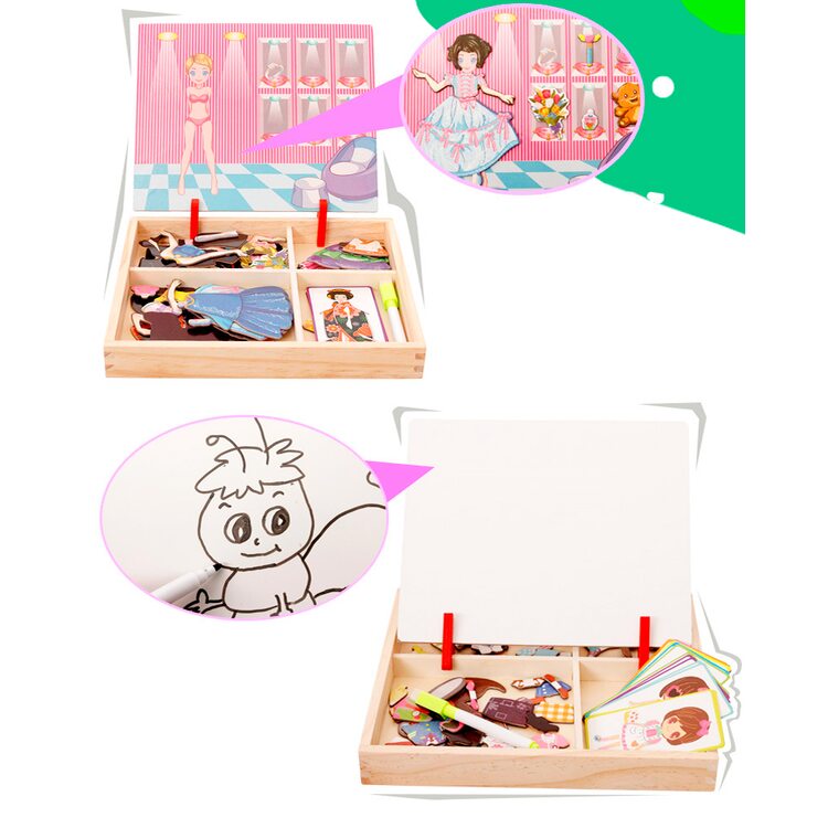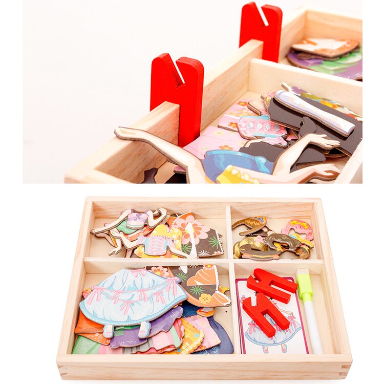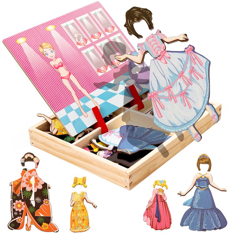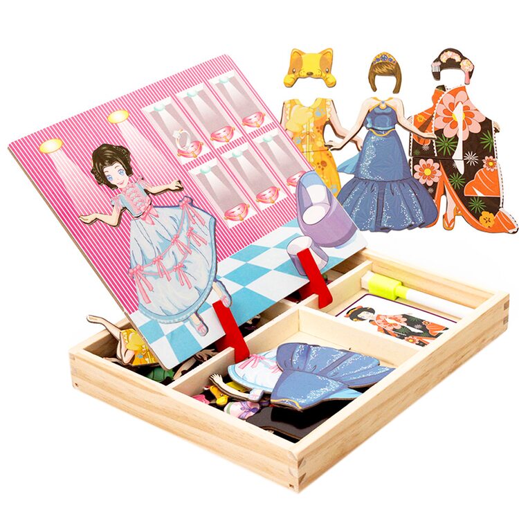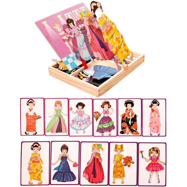 Чарівна казка про Попелюшку знайшла нове втілення в магнітній грі "Принцеса" - навряд чи малюк втомиться одягати ляльку в різноманітні вбрання з дерев'яною коробки. Цей нескладний конструктор вчить дитину орієнтуватися в просторі, підбирати гардероб для різних заходів, формує гарний смак. Також магнітна гра "Принцеса" познайомить з базовими фасонами і жіночими нарядами різних країн. Намагнічена кришка служить планшетом для творчості і дошкою для малювання, якщо повернути її зворотною стороною.