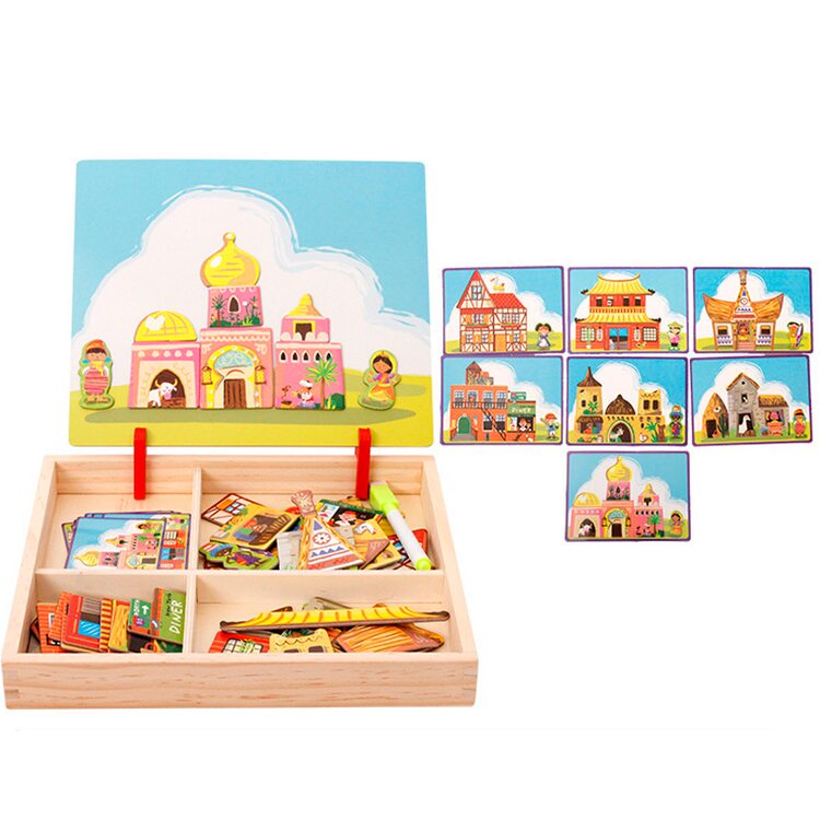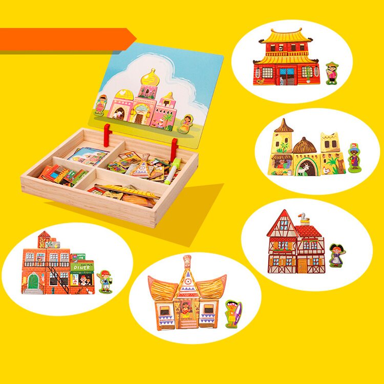 Набір представлений безліччю деталей, з яких можна викласти різні будівлі, споруди різних народів. У комплект також входять 7 карток із зображеннями-завданнями, які потрібно викласти. Всі деталі яскраві і приємні на дотик, добре кріпляться до металевих поверхонь. Також, ваша дитина зможе помалювати на зворотній (білій) стороні досточки маркерами на водній основі (в наборі 1 маркер). У нашому магазині такі маркери представлені.