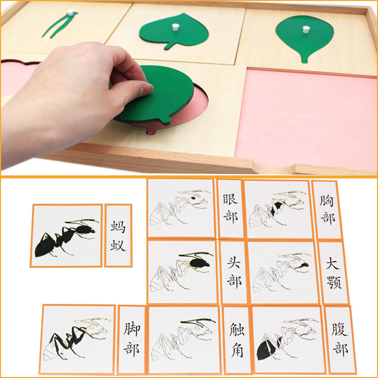 Даний матеріал складається з дерев'яного ящика з п'ятьма висувними ящиками в ньому. У висувних ящиках містяться 14 дерев'яних дощечок-вкладишів з випиляними у вигляді листя фігурами. Всі фігури-вкладиші зеленого кольору і лежать в рамках кольору дерева. Дно ящиків рожеве. Три комплекти карт для кожної фігури-вкладиша, що міститься в комоді з намальованими представниками рослинного і тваринного світу.
