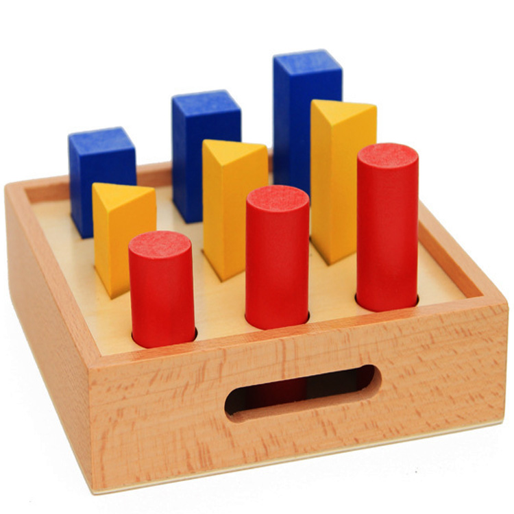 На дерев'яній основі вирізано 9 отворів, які за формою відповідають 3 фігурам: квадрат, трикутник і коло. Кожна фігура представлена в різних розмірах. Завдання: потрібно вибудувати фігури в потрібні комірки, які за формою будуть збігатися в порядку зростання або зменшення.