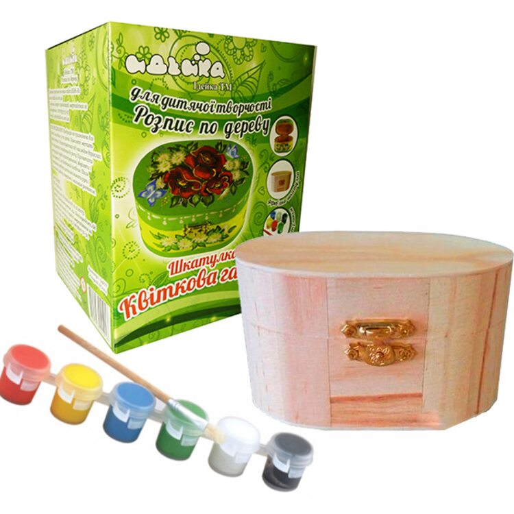 Розпис по дереву - захоплююче, творче заняття. З чистою скриньки, розписаної в ручну виходить незвичайний, прекрасний витвір. А зроблене дитячими ручками - творіння стає ще прекраснішим. У наборі: 6 акрилових фарб, кисть і інструкція по виконанню.