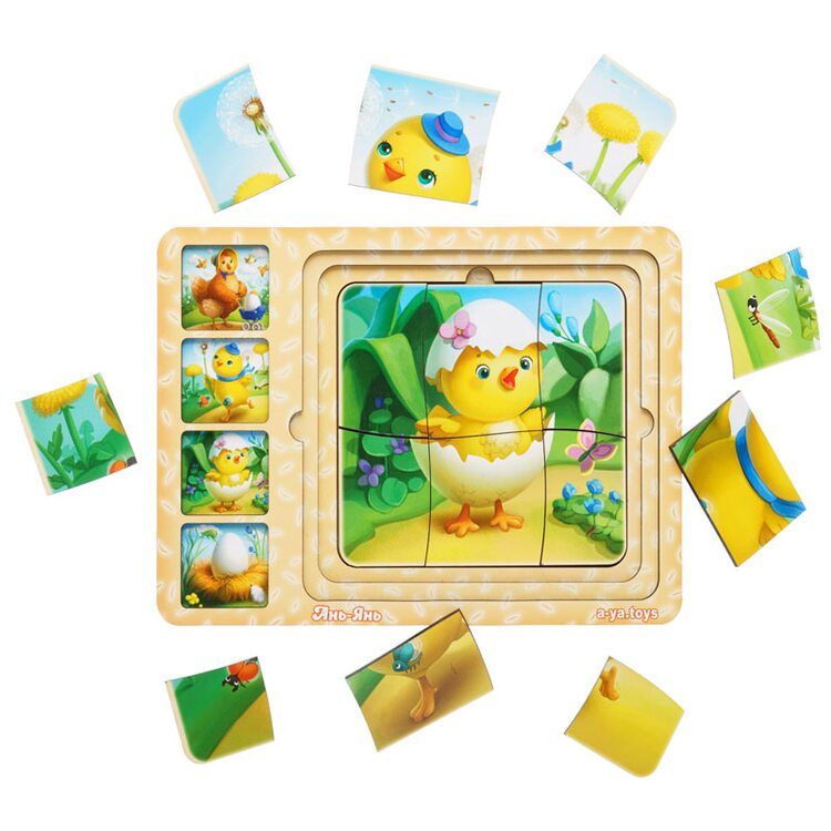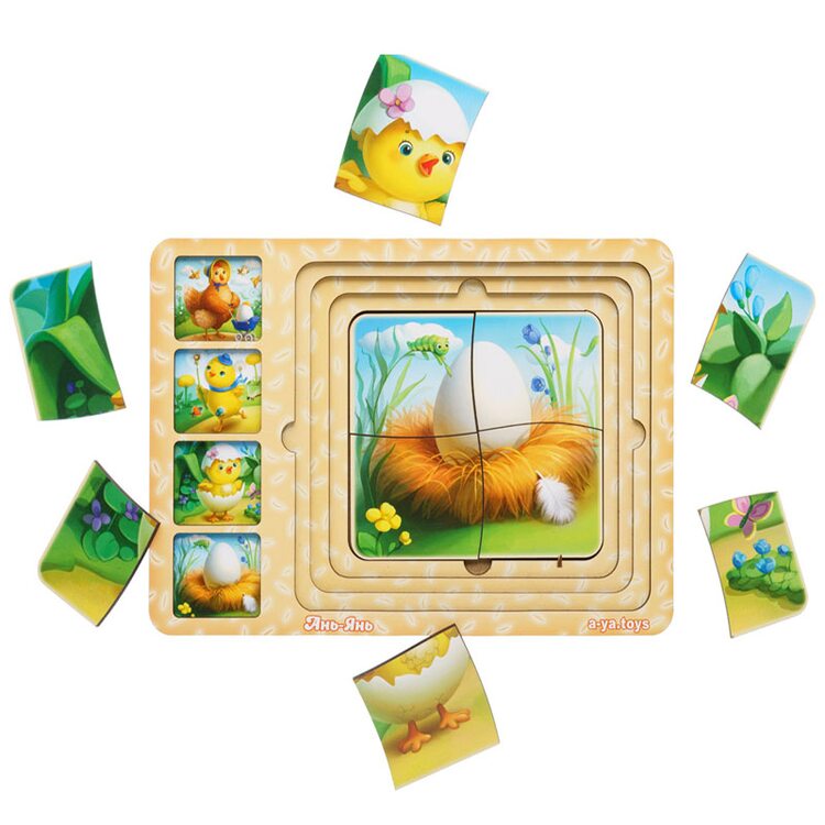 Тематичний пазл, який показує як зі звичайного яйця з'являється на світ миле, жовтеньке курча, яке з часом стає дорослою курочкою. Пазл чотирьохшаровий з різною кількістю деталей 4,6,9 і 12. Кожен пазл складається окремо - верхній найбільший, наступні зменшуються в розмірі.