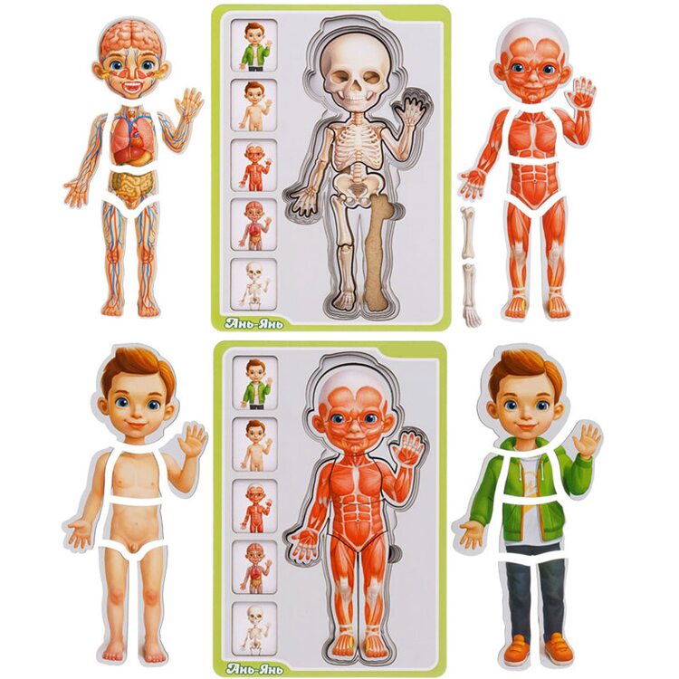 Багатошаровий пазл у вигляді хлопчика, на прикладі якого показується докладна будова людини: вивчення скелета, м'язової тканини, кровоносної системи, органів, шкірного покриття. Наочно посібник з особливостями будови людини допоможе дитині розширити свій кругозір, придбана інформація стане в нагоді в школі на уроках біології.
