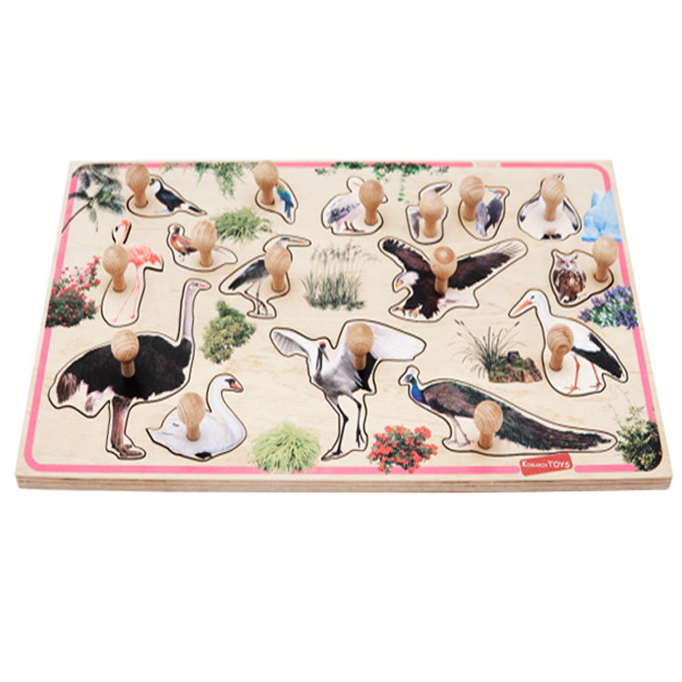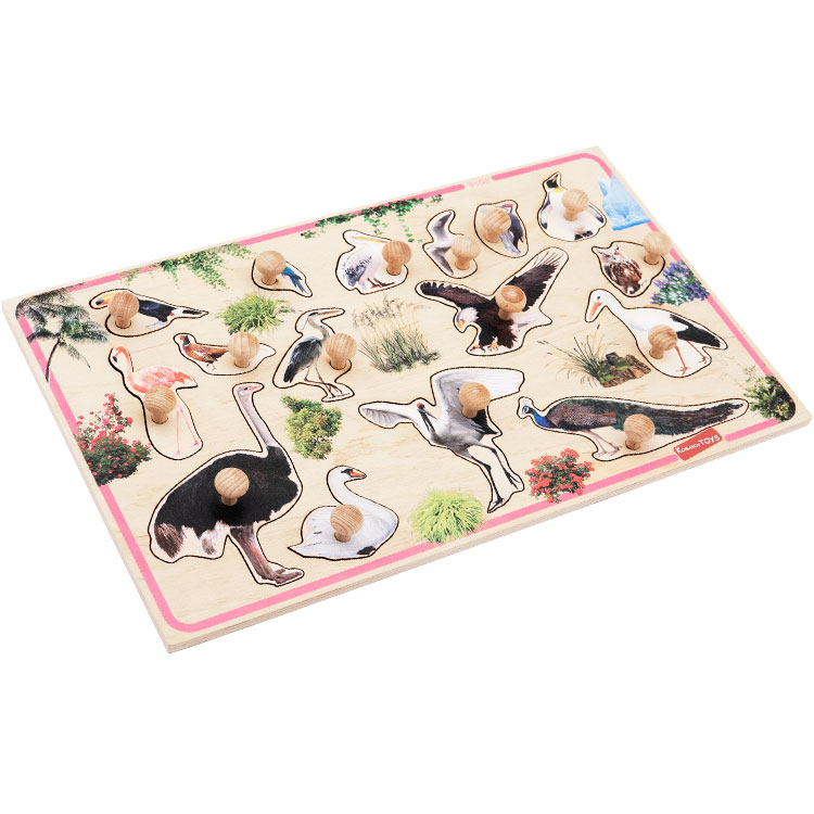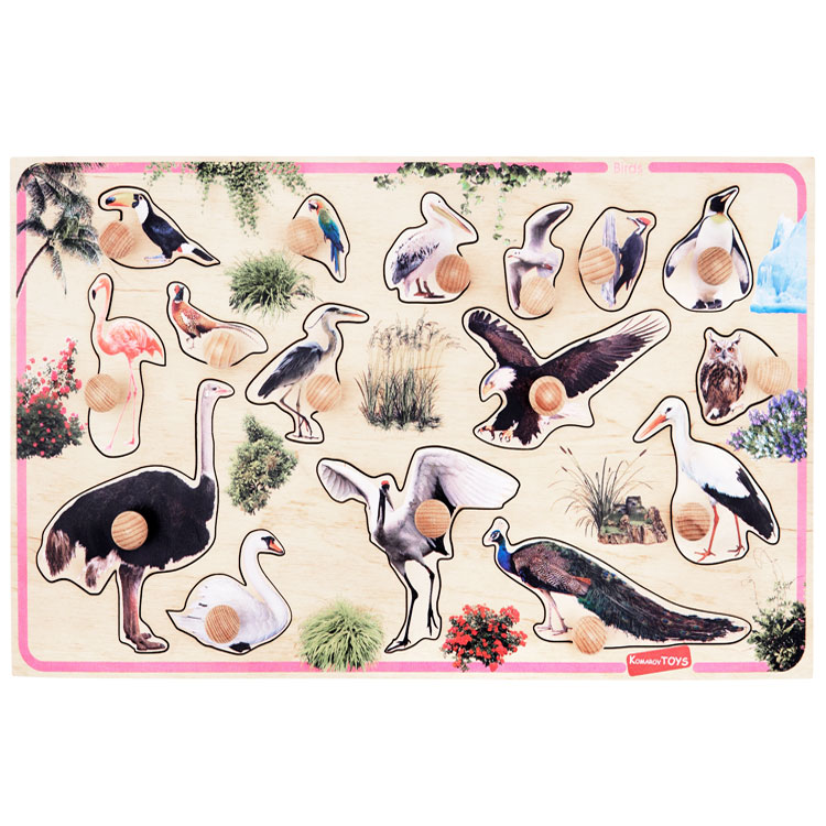 Великого розміру рамка-вкладиш з великими, реалістичними вкладишами з птахами різних видів. Кожен вкладиш оснащений дуже зручною і великою дерев'яною ручкою. На основі розміщено 16 вкладишів.