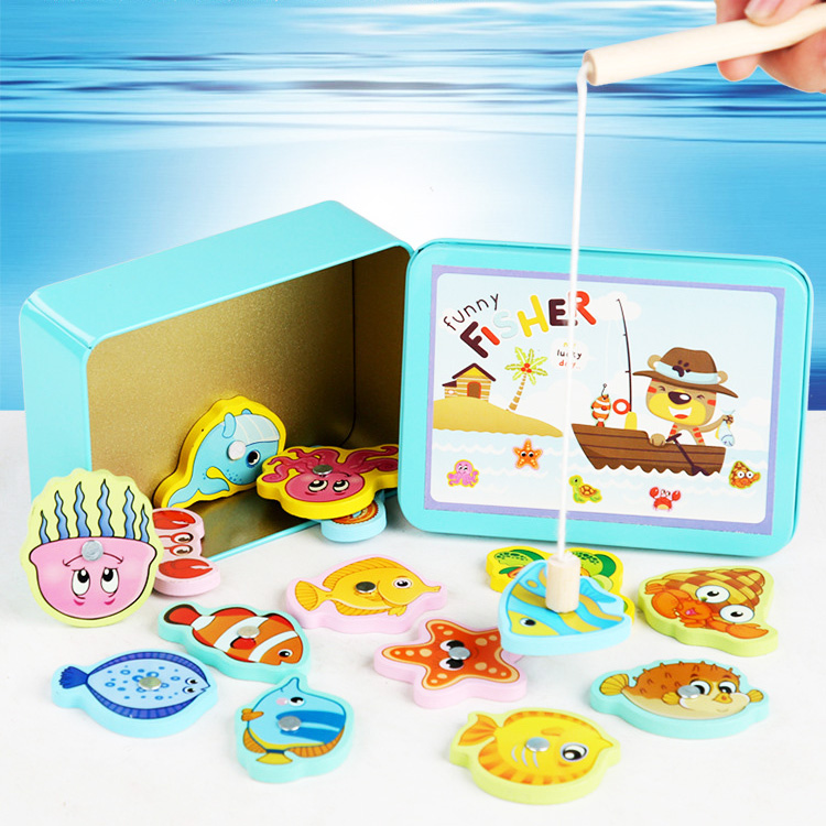 Риболовля з барвистими дерев'яними рибками і маленькою вудкою. Всі деталі упаковані в зручну металеву коробку з кришкою.