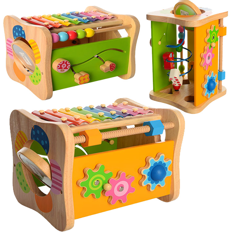 Універсальний куб, який об'єднує в собі 9 ігор: ксилофон (метал. 8 тонів); дерев'яний лабіринт-змійка; пальчиковий лабіринт - спіраль; сортер (трикутник, квадрат, коло, серце); шестерінки (дрібна моторика, ланцюгова реакція); закручування деталей по різьбі; шнурівка - деталі для сортера йдуть з отворами, через які можна протягувати шнурочок з дерев'яною голочкою (входить в комплект).
