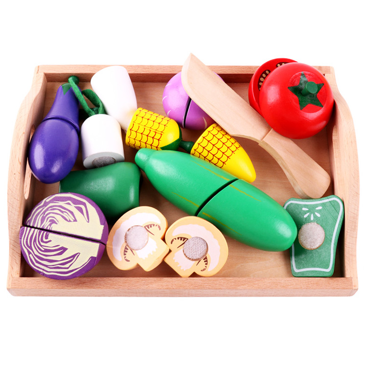 Ігровий набір овочів розрізних: перець, огірок, кукурудза, помідор, капуста, баклажан, білий редис і цибуля. У комплекті також дерев'яна дошка-піднос і ніж. Граючи, дитина зможе готувати різні страви від салату до борщу.