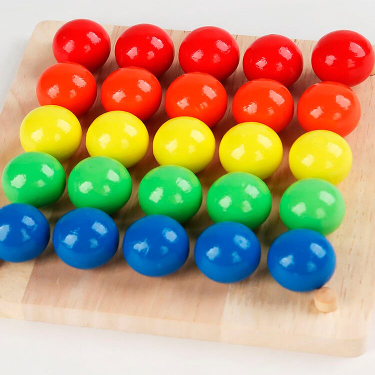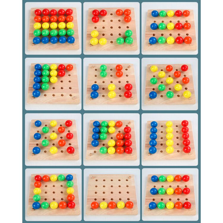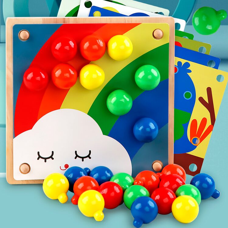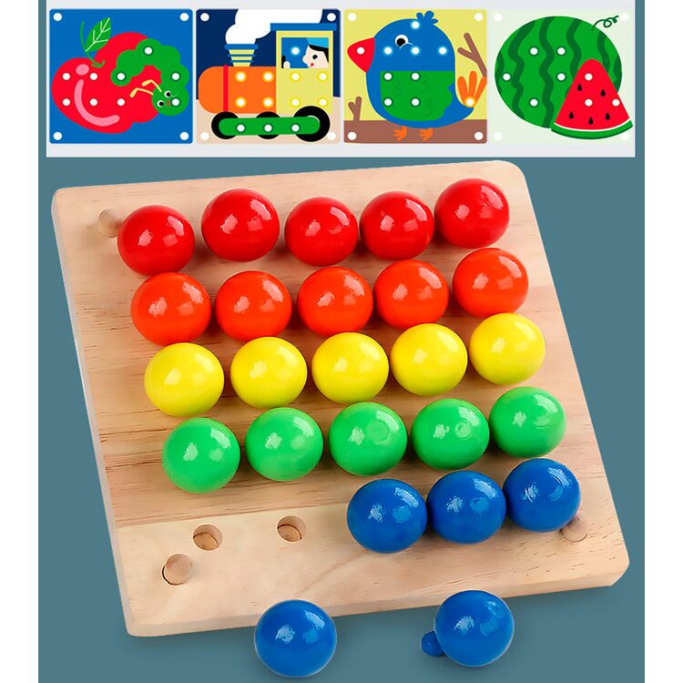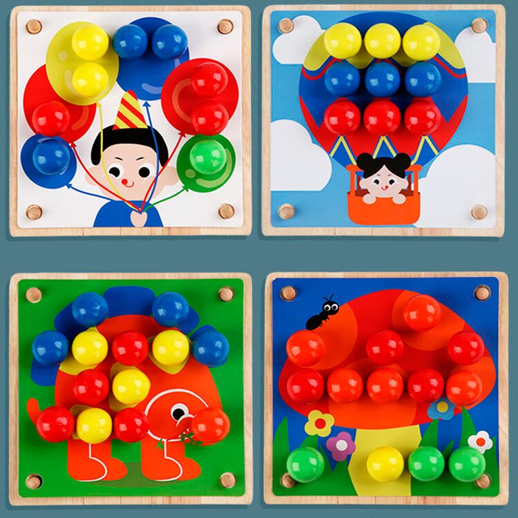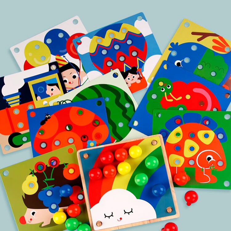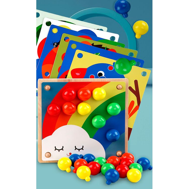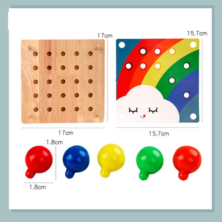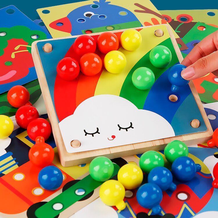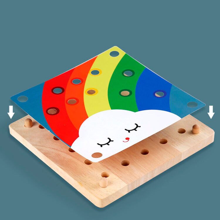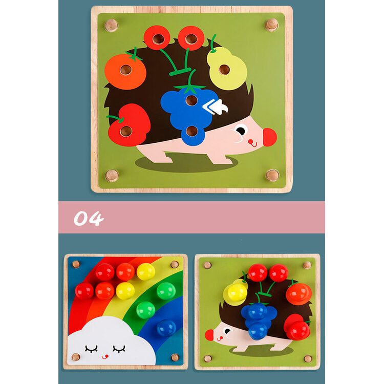 Розвиваюча гра для самих маленьких. Набір складається з 12 картинок різної тематики та 30 кольорових дерев'яних цвяхів по 6 шт. кожного виду (червоний, блакитний, салатовий, жовтий, коричневий). Дрібні деталі упаковані в мішечок із зав'язками. Діти повинні вставити дерев'яні гвоздики відповідно до малюнка сцени, щоб завершити дизайн картини.