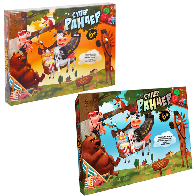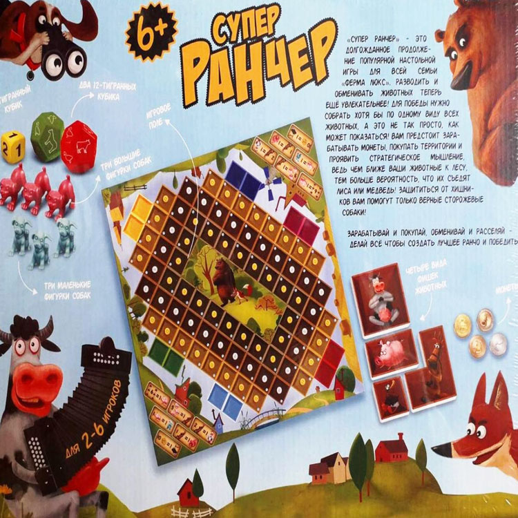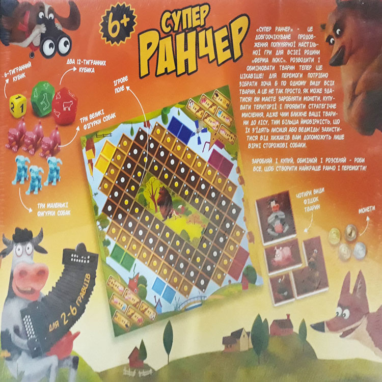 Настільна гра для всієї родини. Продовження мега популярної гри «Ферма Люкс». Нудьгувати не доведеться. Хочеш відчути себе справжнім фермером? Це гра якраз для тебе. Завдання розвести у себе на ранчо по одному виду всіх тварин. Але не все так просто! У тебе є суперники - такі ж фермери. І не варто забувати про хижаків - лисиця і ведмідь, які причаїлися в лісі і вичікують підходящого моменту, щоб поцупити твоїх тварин.