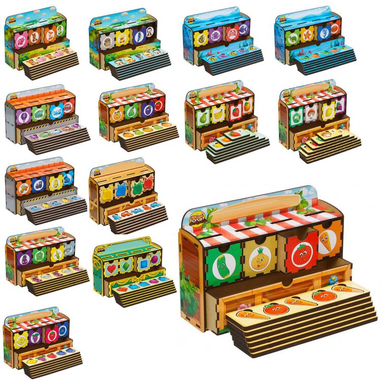 Посібник являє собою комодик, який складається з 5-ти висувних ящиків: 4 (маленьких) для сортування за видами та 1-го (великий) для зберігання вкладишів й рамок для них. У набір входять 30 вкладишів з малюнками певної тематики, яку Ви вибрали, 6 рамок по 5 вкладишів, де потрібно знайти кожному вкладишу своє місце.