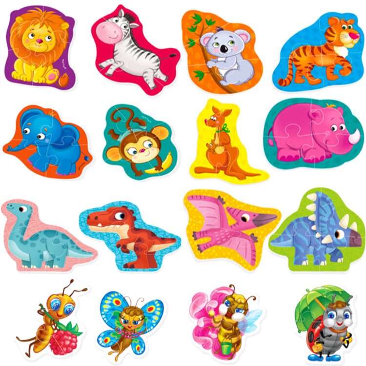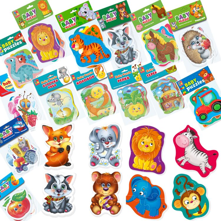 Бебі пазли від ТМ «Vladi Toys» - безліч яскравих картинок різних тематик: тварини, фрукти, овочі, казки, іграшки, транспорт, динозаври.