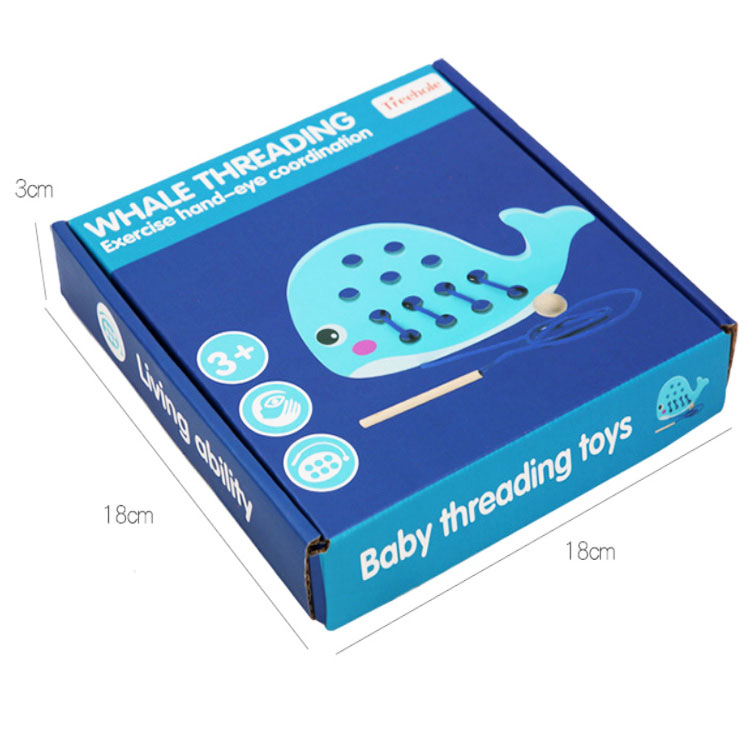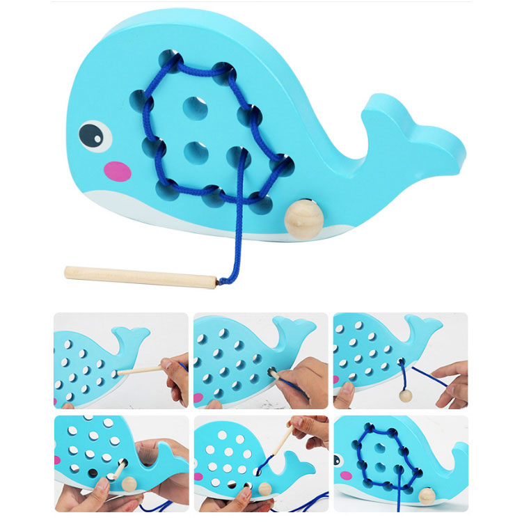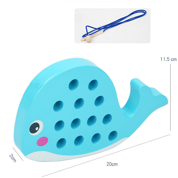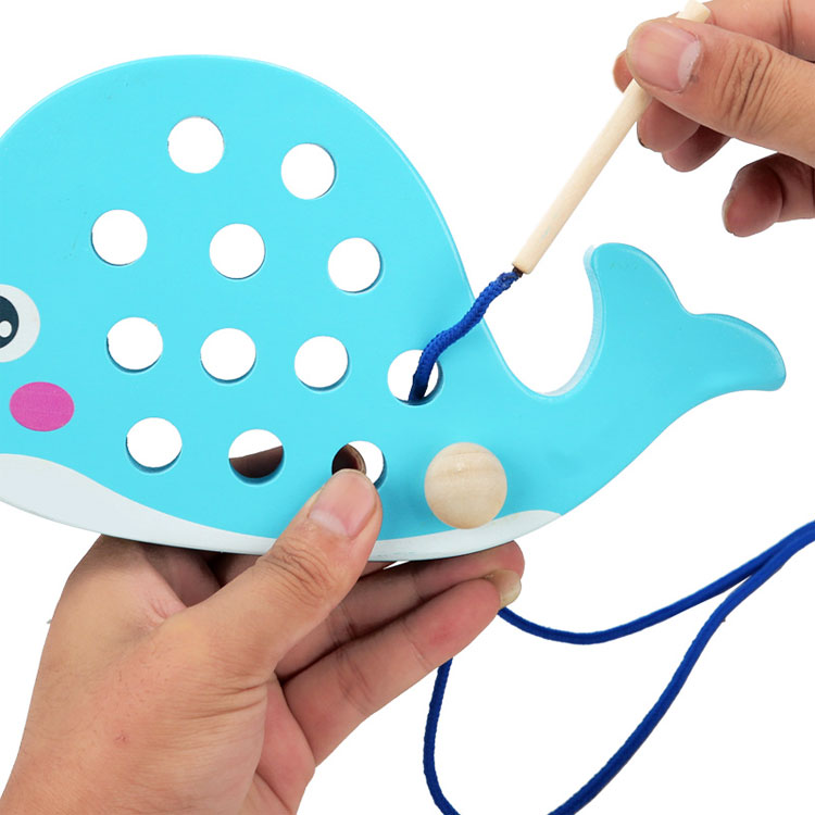 Шнурівка виконана у вигляді великої риби Кит з безліччю отворів, через які потрібно протягувати дерев'яну голочку з шнурочком. Розвиваємо дрібну моторику, вчимося координувати свої рухи.