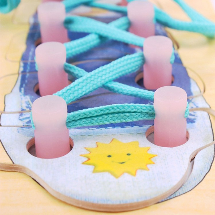 На дерев'яній основі знаходяться 3 шнурівки у вигляді різного виду черевиків. Зашнуровивая черевички, дитина опановує навички шнурування, які зможе задіяти і в повсякденному житті. Такого виду шнурівка підходить для проведення групових занять.