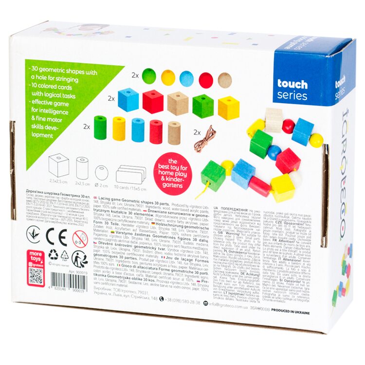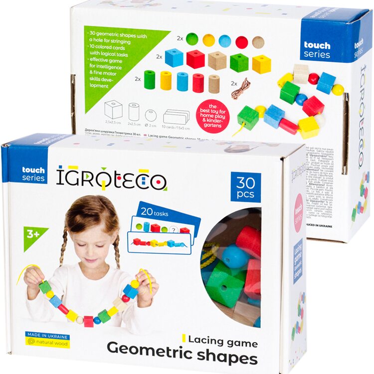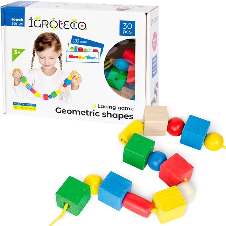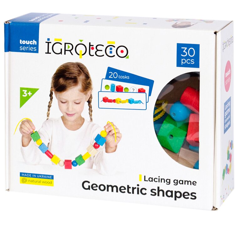 Шнурівка Геометричні фігури познайомить дитину з новими формами. Яскраві фігурки легко і цікаво поєднувати між собою шнурочком і в той же час вивчати кольори, поняття послідовності, увагу, підготовка до школи.