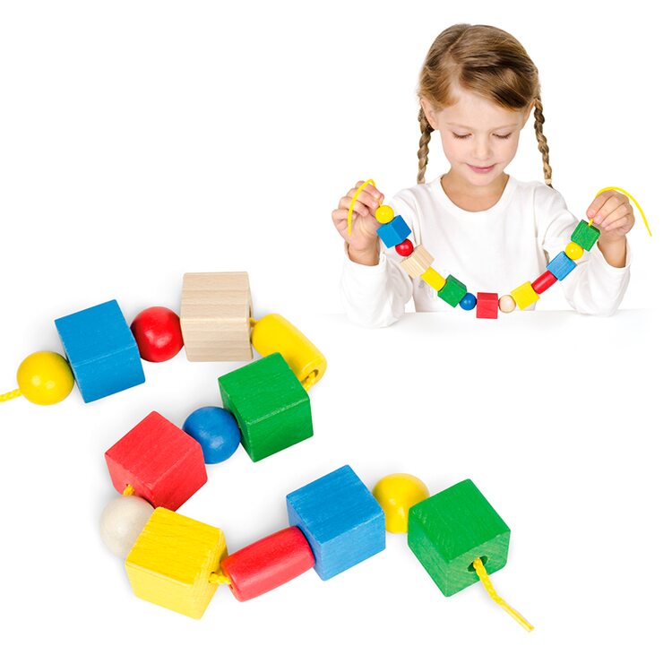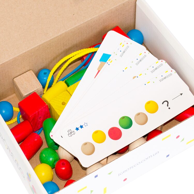 Шнурівка надовго захопить Вашого малюка. Розглядати різнокольорові кубики, циліндри, складати їх, пробувати "на зуб" можна просто до нескінченності.